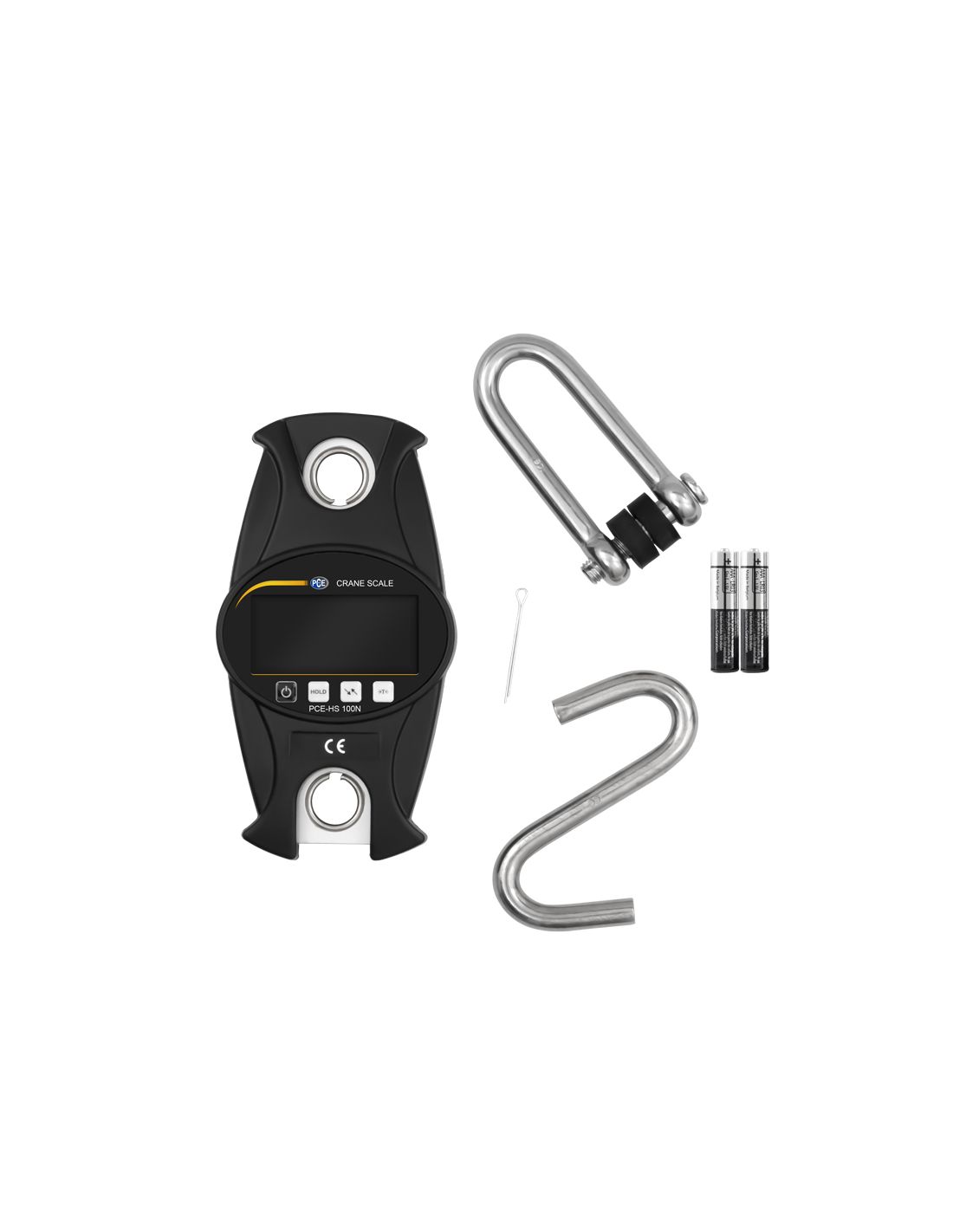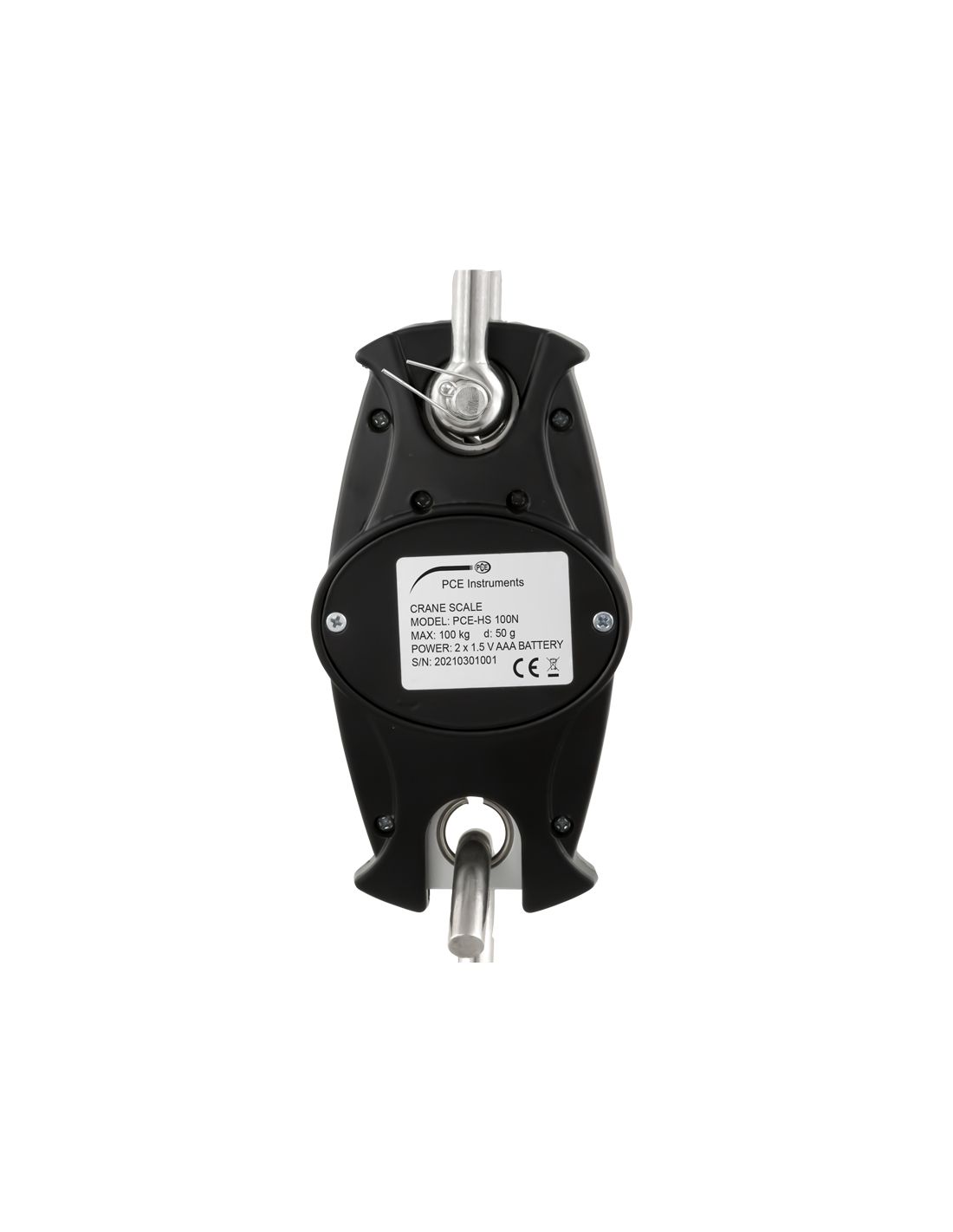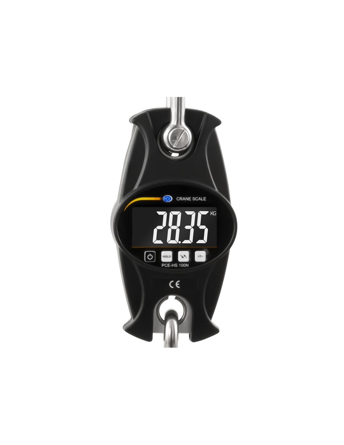 Balance à grue avec boîtier métallique / Plage : 0 ... 100 kg / Arrêt automatique après 15 minutes d'inactivité / Fonctionne sur pile / Fonction "HOLD" / Hauteur chiffres : 22 mm / Unités : kg, lb, N / Certificat d'étalonnage en option La balance à grue pèse dans une plage de 0 à 100 kg. La balance a grue est un instrument de mesure exact puisqu'elle pèse avec une précision de ±1 % F.S. L'écran LCD possède des chiffres de 22 mm de hauteur. Ceci, combiné au fait que l'écran dispose de rétroéclairage, permet que l'utilisateur lise les valeurs à distance, même dans des endroits sombres. Grâce au boîtier métallique résistant, vous pouvez utiliser la balance à grue même dans des environnements de travail difficiles. La balance à grue indique le poids en kg ainsi que dans les unités lb et N. La balance à grue intègre la fonction Hold qui fige la valeur de mesure sur l'écran. L'adaptateur, le crochet et d'autres accessoires de pesage ont leur propre poids. Pour simplifier le pesage, la balance à grue peut tarer ce poids juste en appuyant sur un bouton. La balance à grue fonctionne avec deux piles de 1,5 V, de type AAA, ce qui permet un usage mobile. Pour prolonger l'autonomie des piles, la balance à grue dispose de la fonction d'arrêt automatique après 15 minutes d'inactivité. En option, vous pouvez commander à PCE Instruments un certificat d'étalonnage ISO pour cette balance à grue.