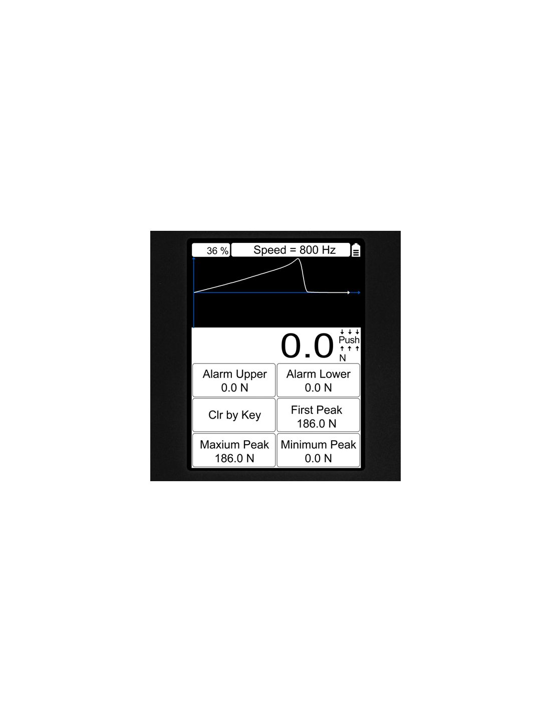 Dynamomètre numérique PCE-DFG N 10 Dynamometre numerique pour traction et compression jusqu'à 10 N / De haute précision / Taux d'échantillonnage jusqu'à 1600 Hz / 6 étais différents / Interface USB / Logiciel Nous vous présentons le dynamomètre numérique PCE-DFG N 10 qui mesure la traction et la compression. Il utilise un intervalle maximum de 10 N. Le PCE-DFG N 10 est un dynamometre numerique précis d'une résolution de 0,005 N. Les valeurs mesurées sont affichées sur le grand écran rétroéclairé. L'écran possède une orientation automatique ou manuelle de 180º, ce qui permet de lire facilement les valeurs. Il dispose d'une mémoire interne de 100 séries de mesure, et d'une interface USB. Le logiciel permet de transférer les valeurs mesurées au PC pour les analyser par la suite. Le boîtier résistant, et le menu intuitif et simple font du dynamomètre numérique PCE-DFG N 10 un appareil facile à utiliser. Le dynamomètre numérique est alimenté grâce à un accumulateur interne et se charge au moyen d'une source d'alimentation incluse dans l'envoi. La durée de fonctionnement est de 10 heures environ. Toutes ces caractéristiques permettent d'utiliser le dynamomètre numérique pour le contrôle de qualité, pour les contrôles des entrées et des sorties des marchandises ainsi que pour le développement de nouvelles pièces ou pour la vérification des pièces de sécurité.