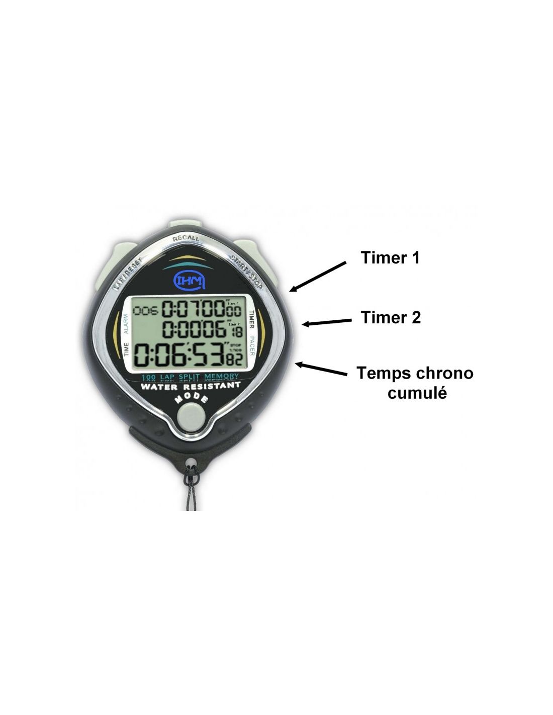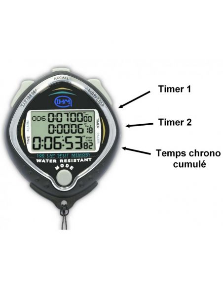 - Chronomètre à main 3 lignes d'affichage ETANCHE à l'imersion 3ATM avec double minuterie combinée répétitive.