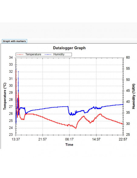 L’hygromètre numérique permet une mesure précise de longue durée, une mesure en temps réel et une mémorisation de la température ambiante et de l'humidité relative de l'air. Les valeurs de mesure mémorisées avec la date et l’heure peuvent être lues sur un ordinateur via l’interface USB. Le logiciel fourni affiche les résultats de mesure dans une liste et un graphique à barres. L’appareil est doté d'un support mural pour une fixation facile.