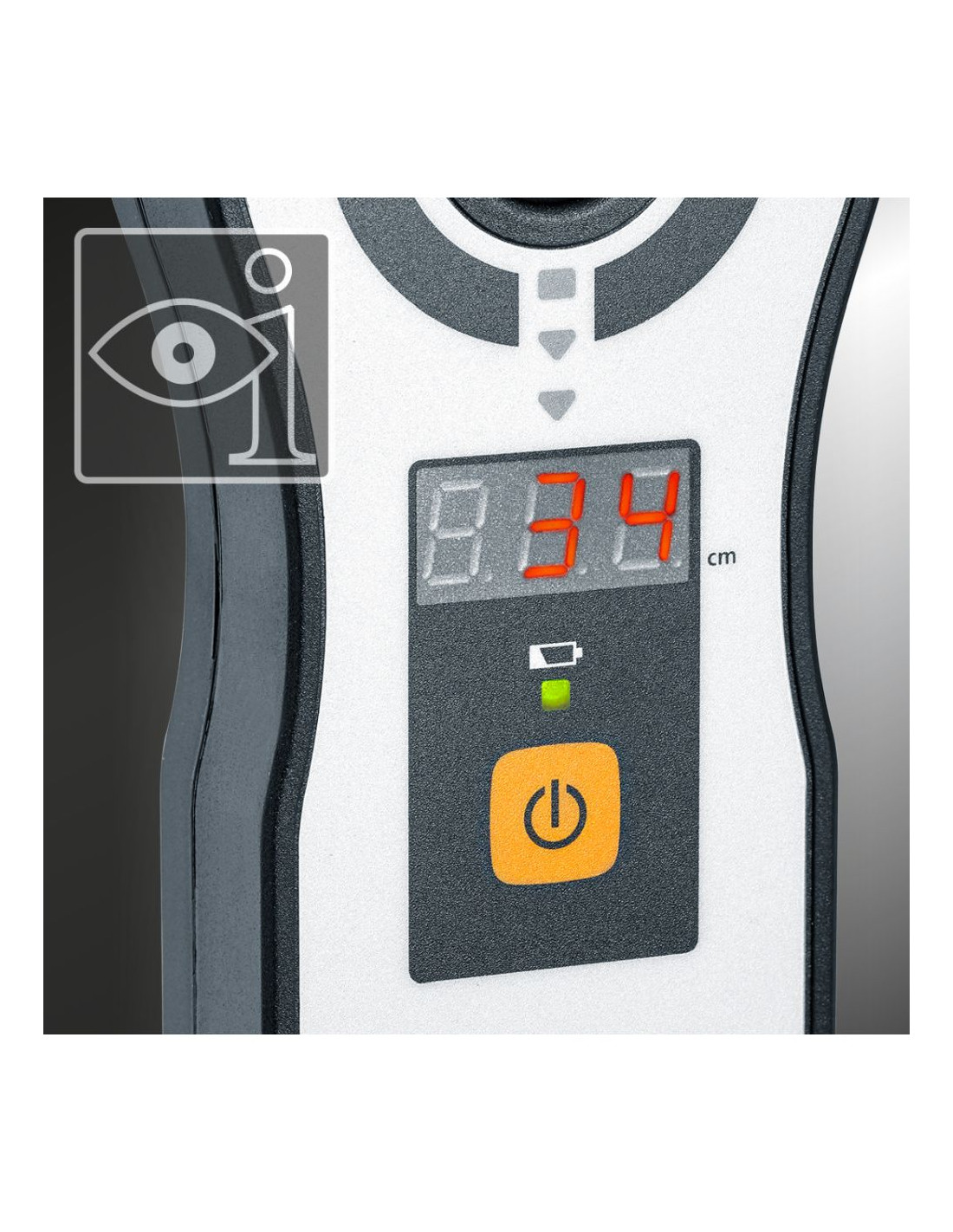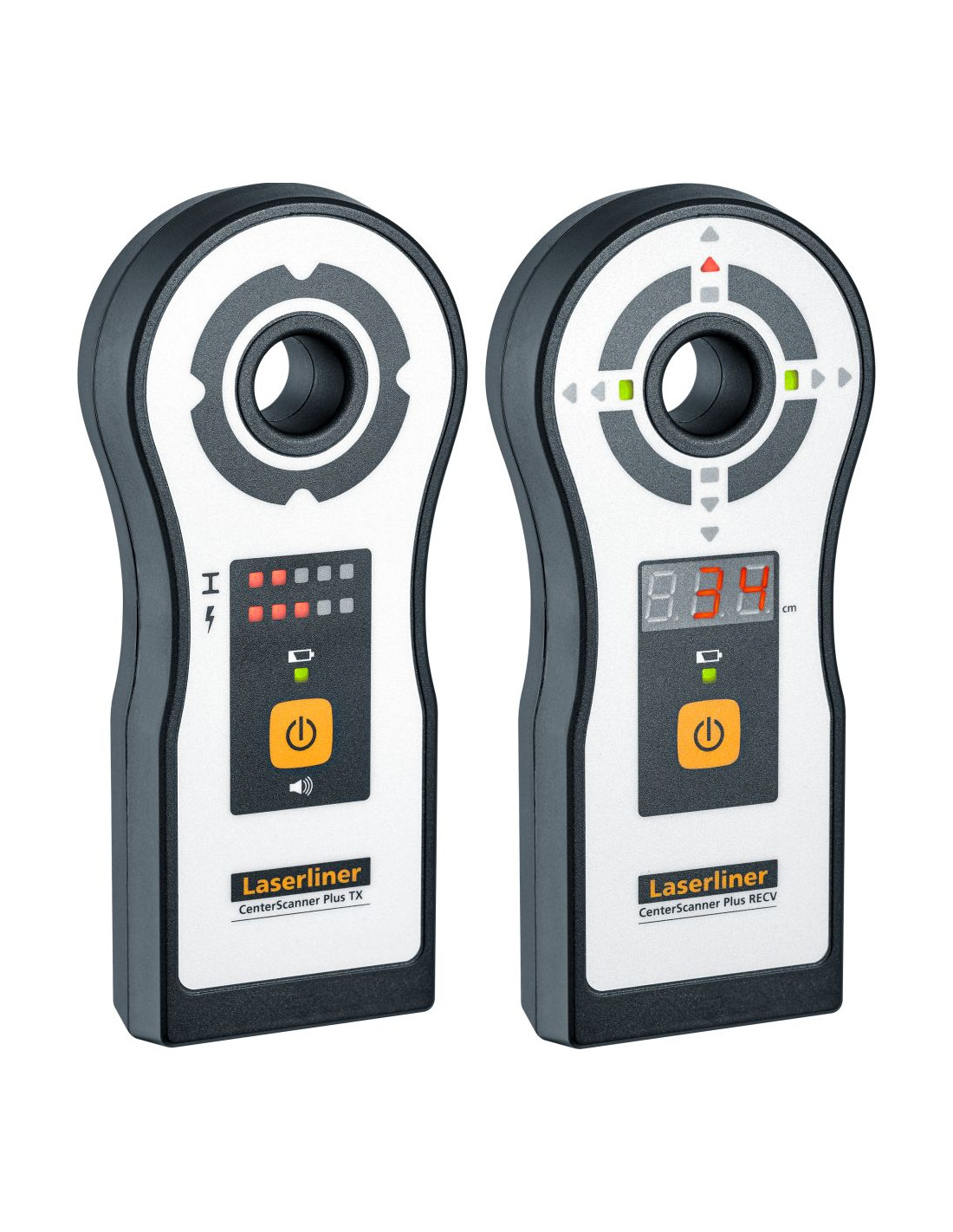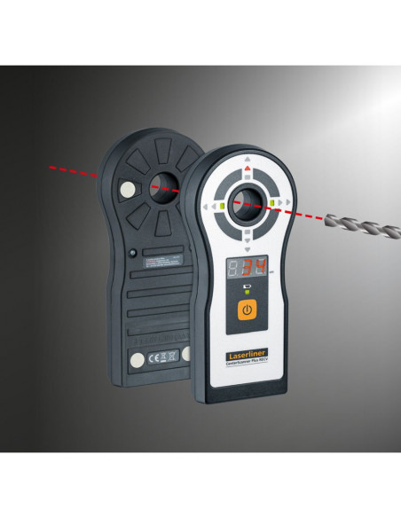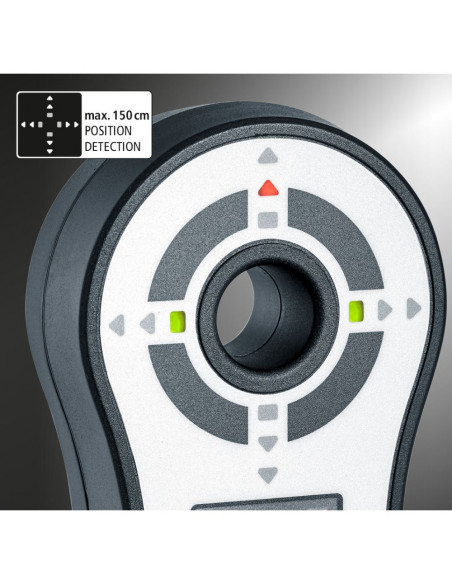 L’appareil de guidage du perçage précis composé d’un émetteur et d’un récepteur, permet un alignement sûr du canal de perçage sur les trous aux murs et au plafond jusqu’à 150 cm. La localisation s’effectue grâce à des indicateurs à DEL bien visibles et des signaux sonores. Des repères de marquage facilement accessibles dans l’émetteur et le récepteur servent au centrage. L’écran LCD intégré permet de déterminer la profondeur de perçage nécessaire jusqu’à 200 cm. L’émetteur TX avec identification intégrée de la tension et du métal permet d’éviter efficacement les perçages erronés. Lors de la détection d’objets étrangers, un avertissement visuel et sonore est émis.