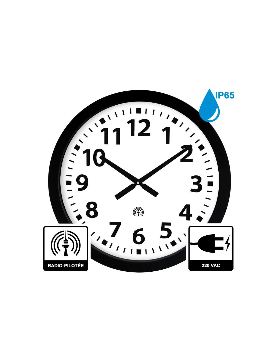 Horloge Ø 600 mm - Verre minéral - Sur secteur - ABS noir - Etanche IP65 - Radio-pilotée