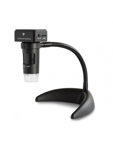 - Le microscope WiFi est fourni avec une batterie intégrée, un pied flexible et facile à régler avec col-de-cygne pour un réglage optimal de la hauteur, et un adaptateur secteur