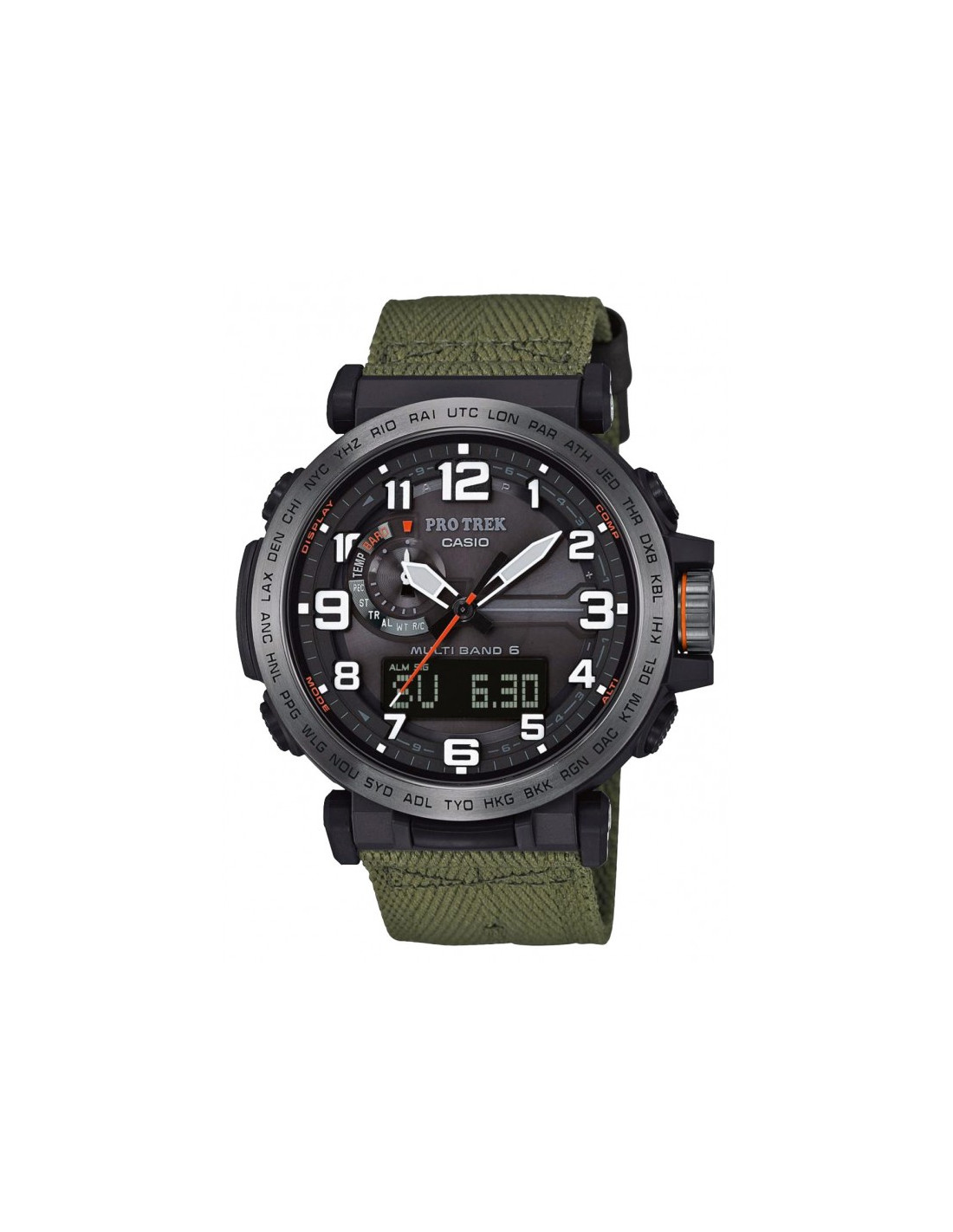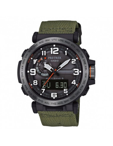 Montre digitale Casio ProTrek avec un boîtier en résine et un bracelet en tissu.