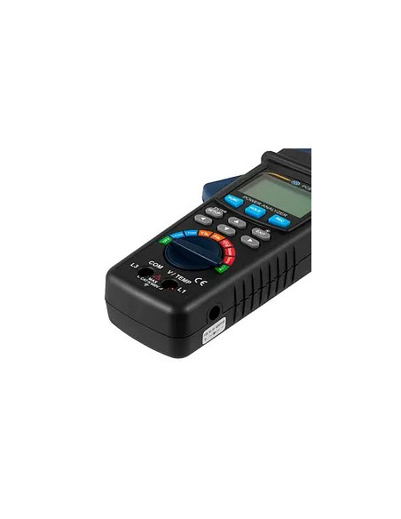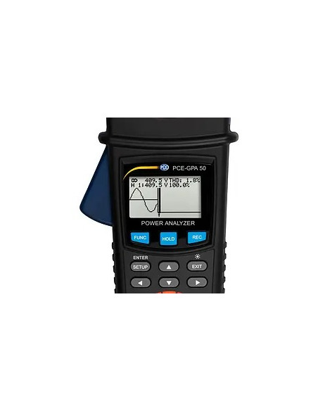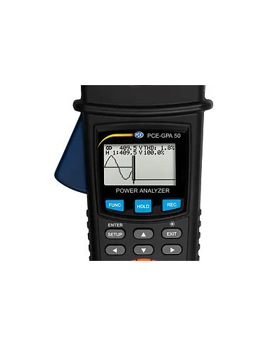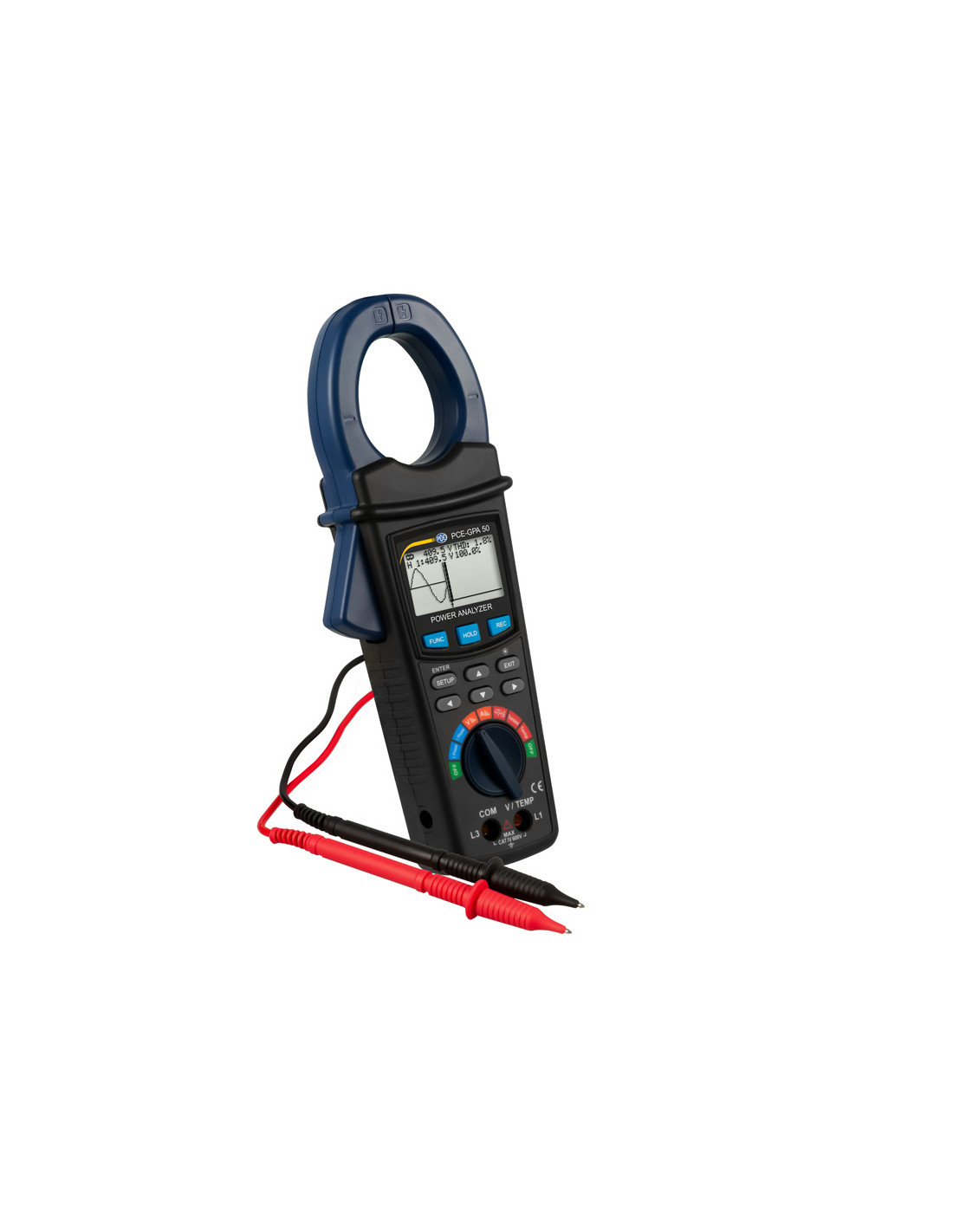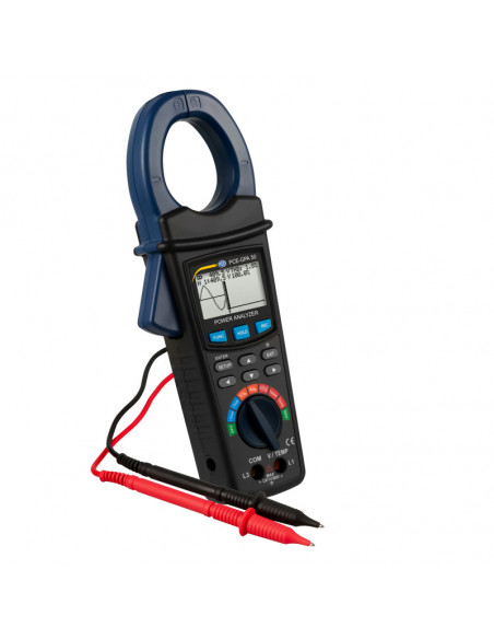 Le multimètre PCE-GPA 50 s'utilise pour mesurer la consommation des appareils électriques monophasiques et triasiques. Le multimetre se distingue par sa vaste plage de mesure allant jusqu'à 2000 A. Un autre aspect à souligner du multimètre est son écran graphique. Le multimètre vous permet de visualiser les valeurs en chiffres mais aussi de visualiser le graphique d'une phase en forme d'ondes. Grâce à cela, le multimètre calcule l'angle de phase et la puissance active, réactive et apparente. De plus, le multimètre indique d'autres paramètres, comme l'énergie, le facteur de puissance et les harmoniques.