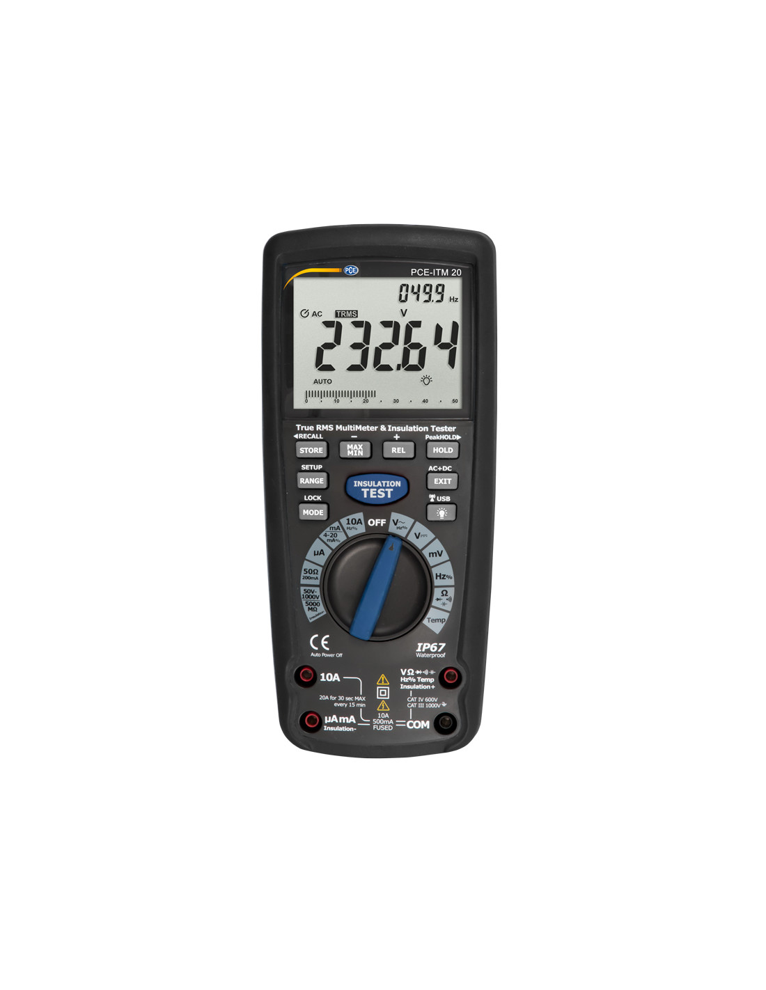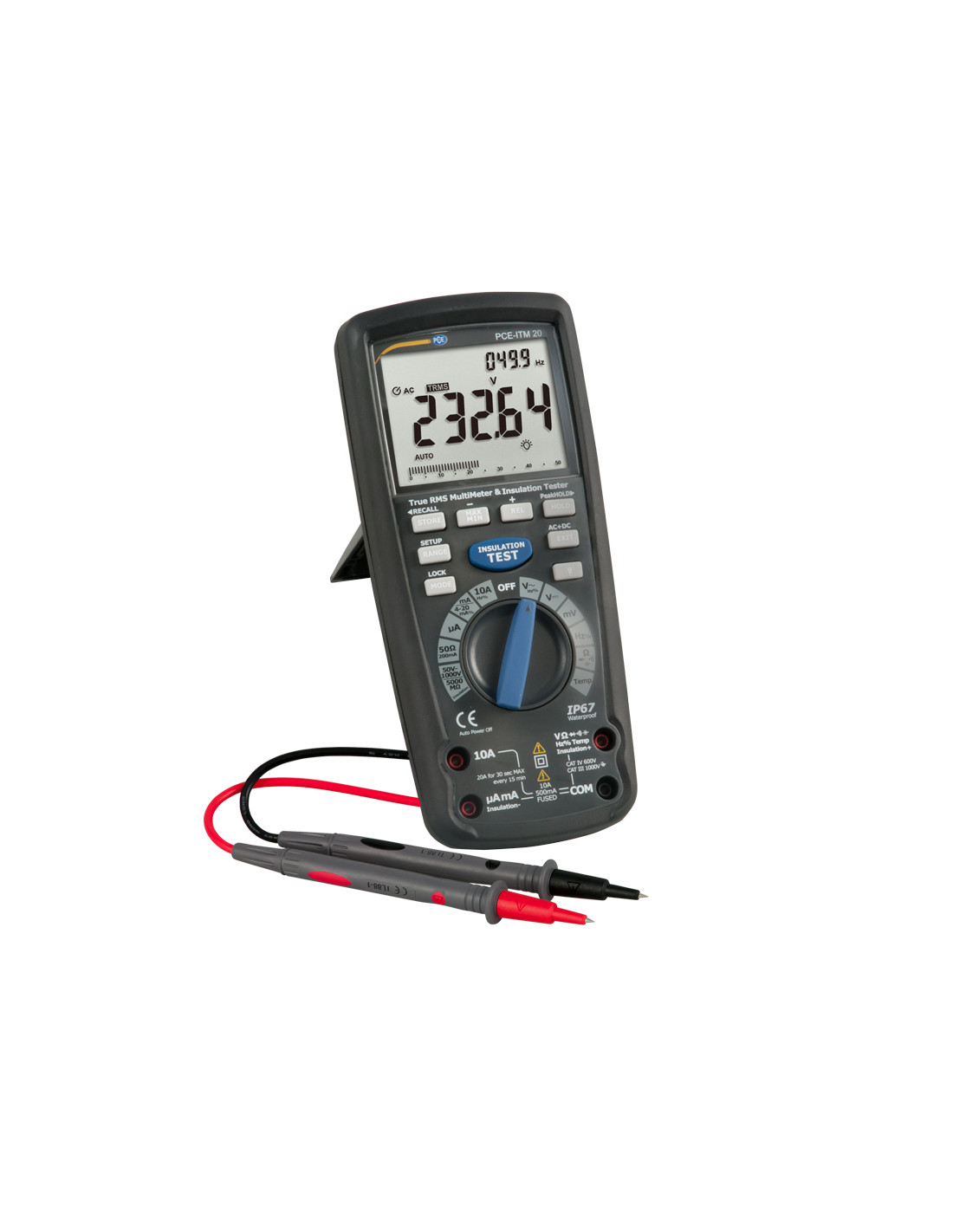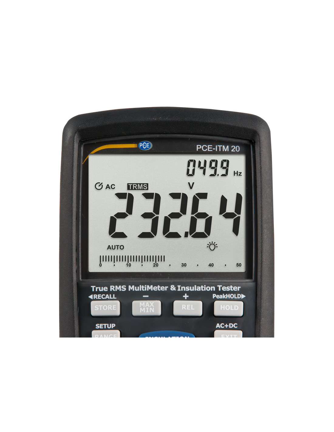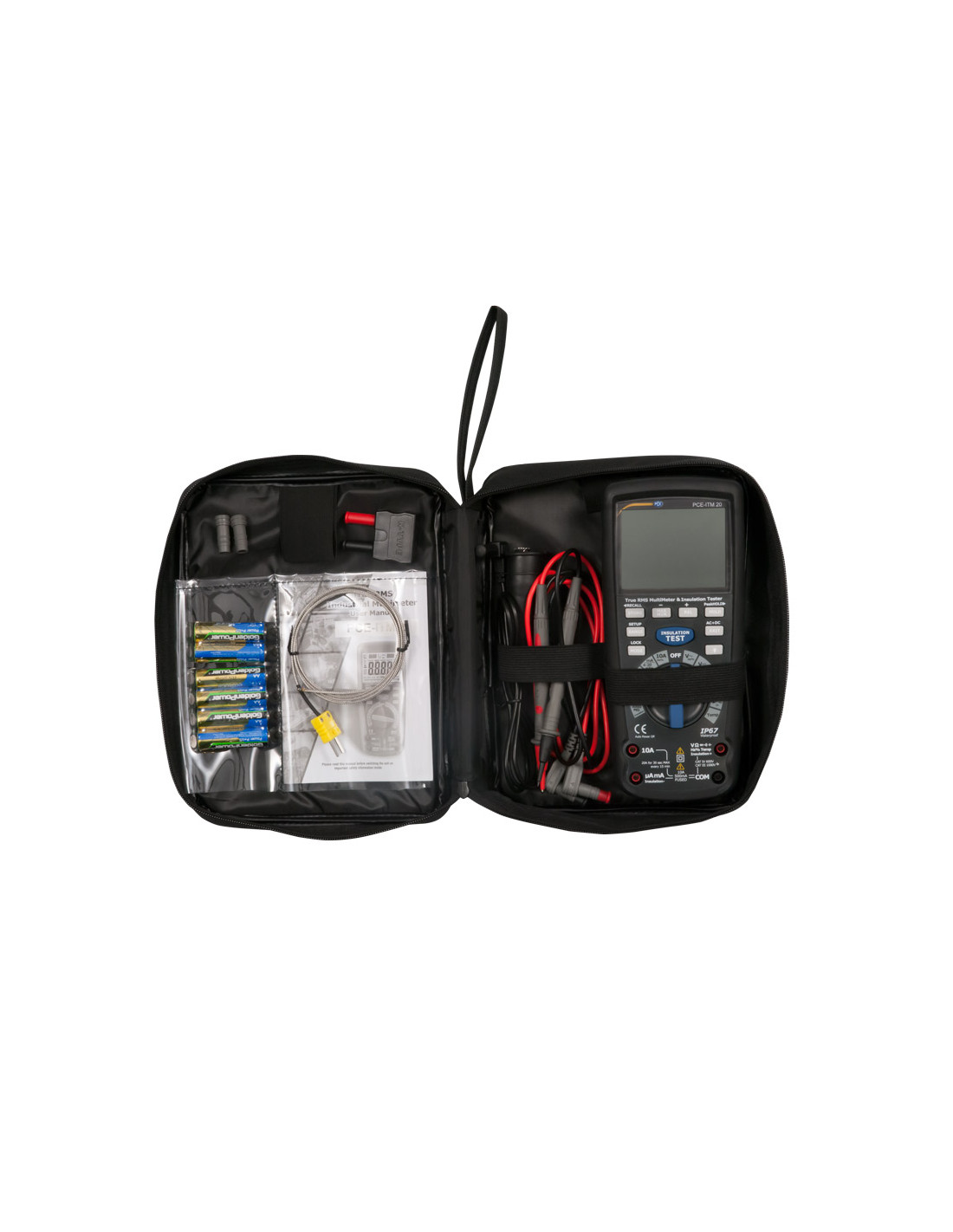 PCE-ITM 20 réunit dans un seul appareil, un multimètre aux vastes fonctions et un appareil de mesure de l'isolation. En plus de mesurer les paramètres de base comme la tension, le courant y la résistance, le multimètre d'isolation est conçu pour mesurer la fréquence et la capacité. L'envoi inclut un thermo-élément pour effectuer les mesures de la température. La sélection automatique de plage permet de travailler de façon rapide et fiable.