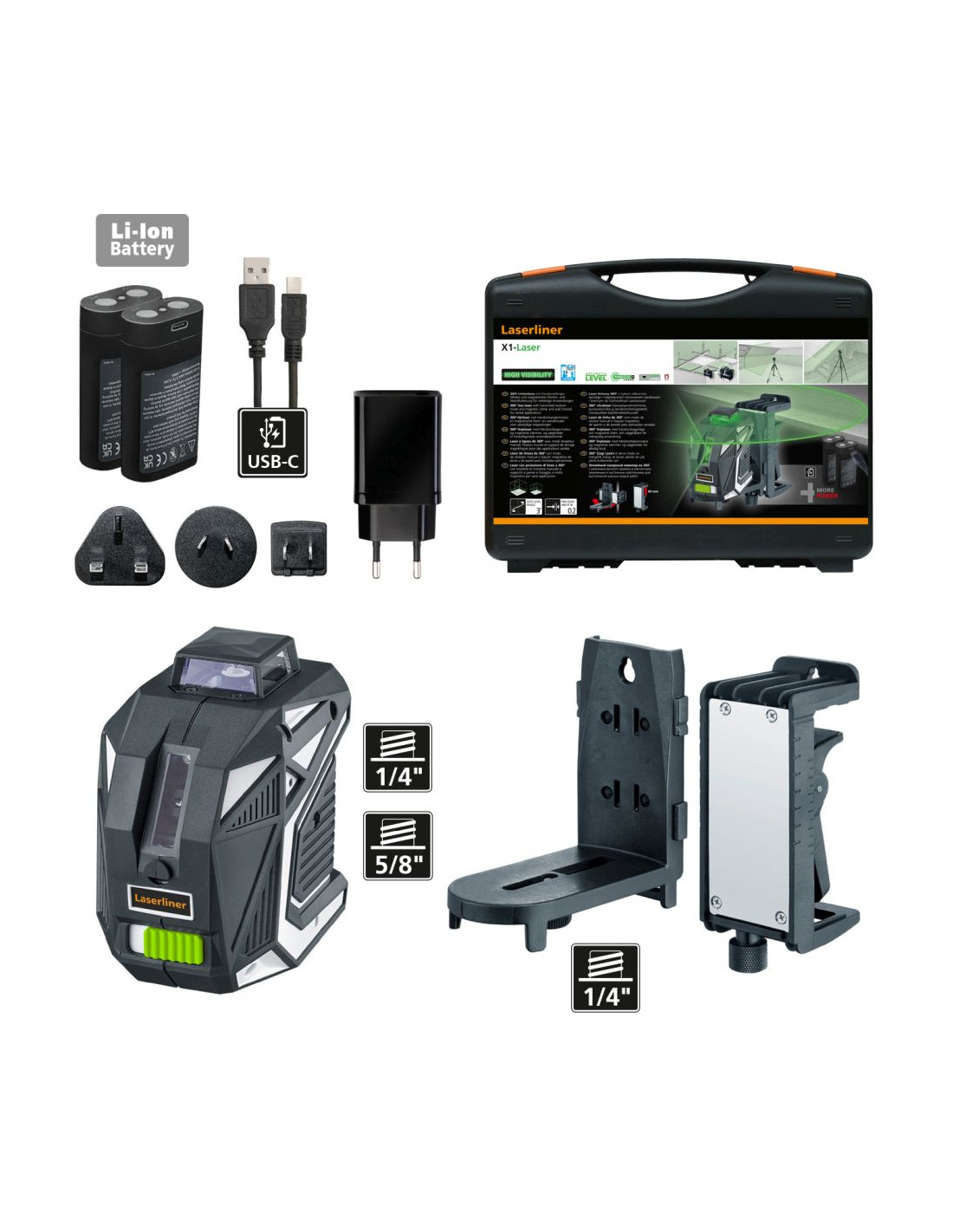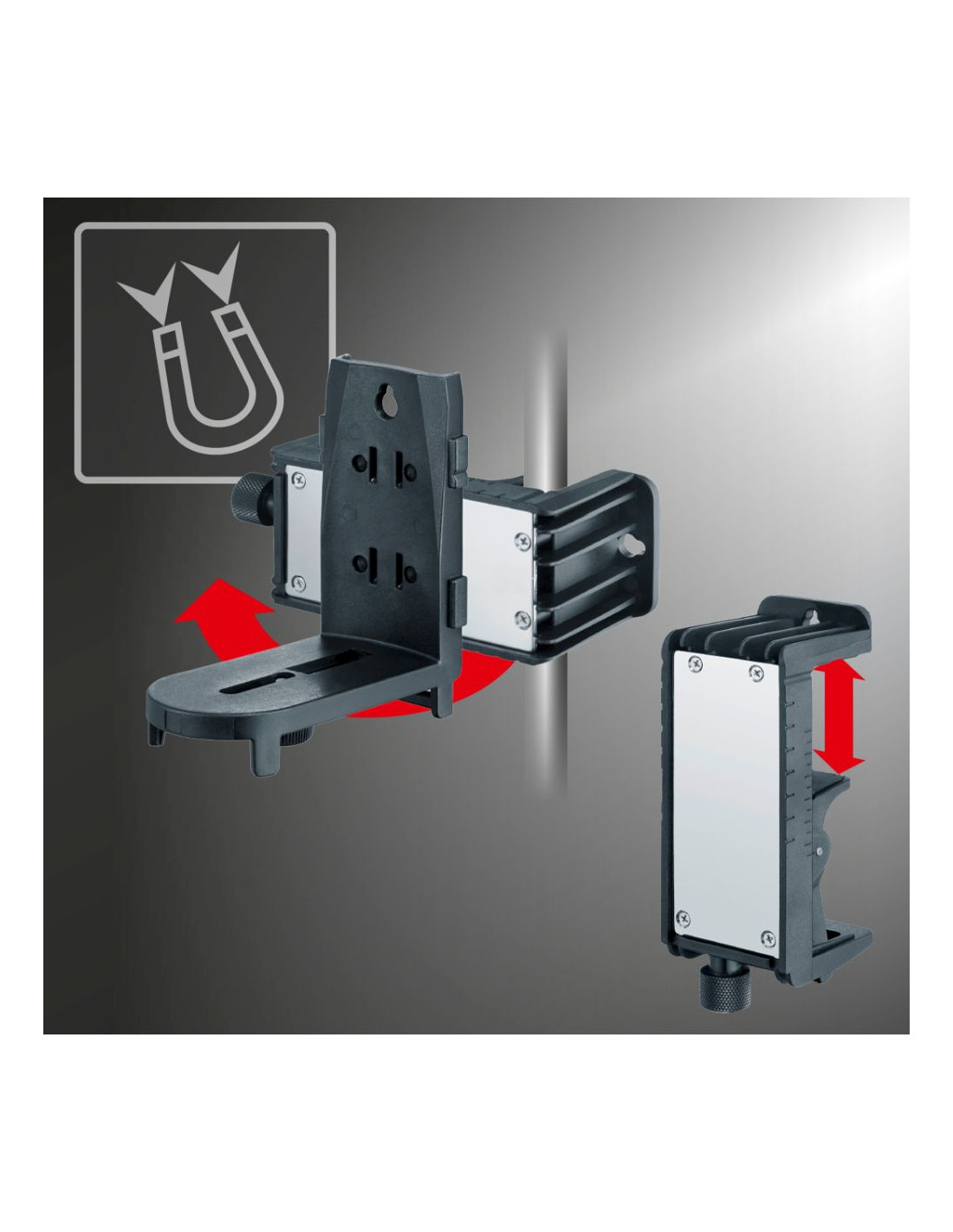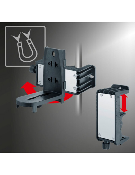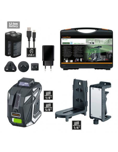 La ligne laser de 360° horizontale et la ligne laser verticale permettent d’aligner avec précision les objets dans toute la pièce. La visibilité est optimale grâce à la technologie du laser vert. Il est possible d’utiliser l’appareil aussi bien seul qu’en combinaison avec d’autres appareils grâce à la fixation murale et au support de serrage magnétiques CrossGrip. Le mode récepteur manuel intégré permet d’utiliser le laser X1 également à l’extérieur.