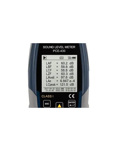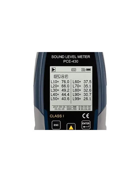 Le sonomètre PCE-430 intègre un grand écran éclairé. L'écran du sonomètre affiche le niveau de pression acoustique de manière numérique et graphique en temps réel. Le sonomètre professionnel intègre un enregistrement de données. Les valeurs sont stockées sur une carte micro SD. Vous pourrez lire les valeurs directement sur votre PC. Vous pouvez aussi connecter le sonomètre par USB à votre PC et lire les valeurs de la mémoire. Le logiciel du sonomètre permet de réaliser une analyse des valeurs. Les domaines d'utilisation typiques de cet équipement sont la mesure de bruit sur des postes de travail, la conformité de normatives, la détection de bruit environnemental, sélectionner le protecteur d'oreilles, déterminer les mesures appropriées pour combattre le bruit, et l'évaluation de l'exposition au bruit.La fonction d'impulsions du PCE-430 enregistre des bruits de courte durée. Le filtre d'octave intégré permet de déterminer de nombreuses différences dans la bande de fréquence. Il est possible d'actualiser optionnellement le filtre de fréquence. La plage de mesure du sonomètre professionnel est de 22 ... 136 dB(A), avec une fréquence de 3 Hz à 20 kHz.