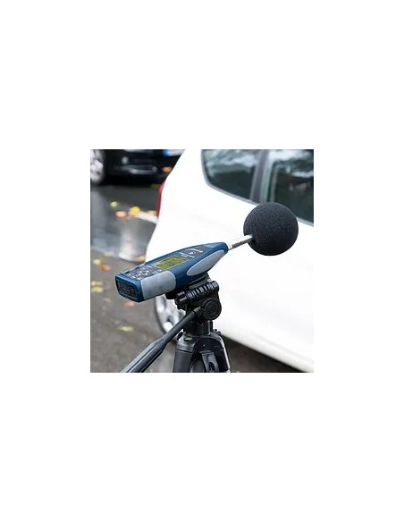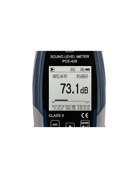 Le sonomètre permet de mesurer différentes pondérations temporaires: lent, rapide et Peak. Il dispose d'une plage de mesure entre 25 et 136 dBA, avec une fréquence de 20 Hz à 12,5 kHz. Il est possible d'établir 3 profils de mesure. L'utilisateur pourra sélectionner les paramètres qu'il souhaite mesurer. Par exemple, il pourra sélectionner entre Laeq, LcPeak, LaFmax, LaFMin, etc. La fonction "Peak-Hold" permet de déterminer la valeur maximale pendant une mesure prolongée et la fixer sur l'écran du sonomètre. Un transducteur de 24 Bit AD et une électronique spécialement développée pour ce sonomètre réduisent le propre bruit à une valeur très faible. L'échantillonnage du signal de mesure supérieur à 48 kHz permet une haute précision et une meilleure stabilité de la valeur de mesure du sonomètre.