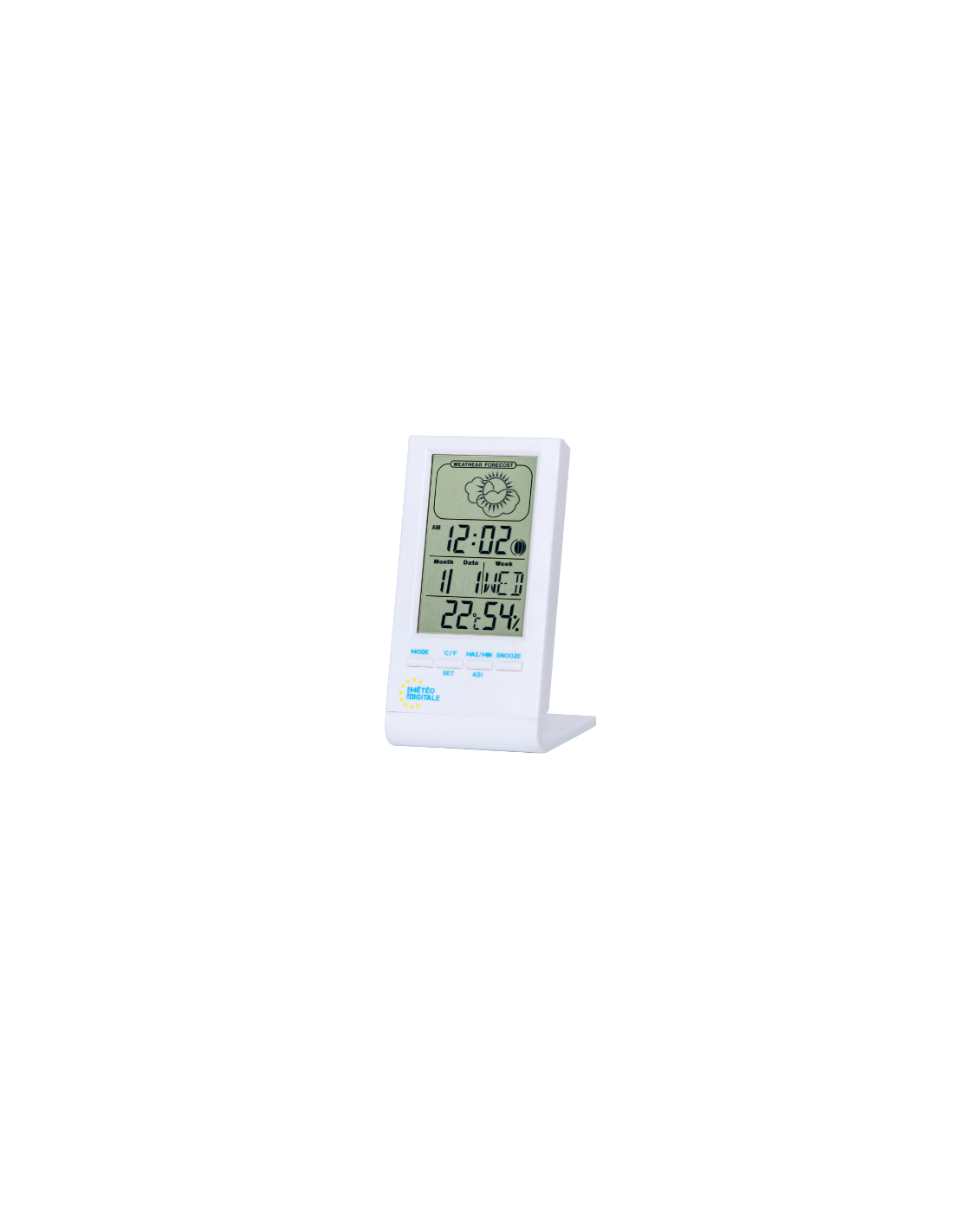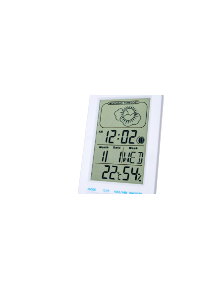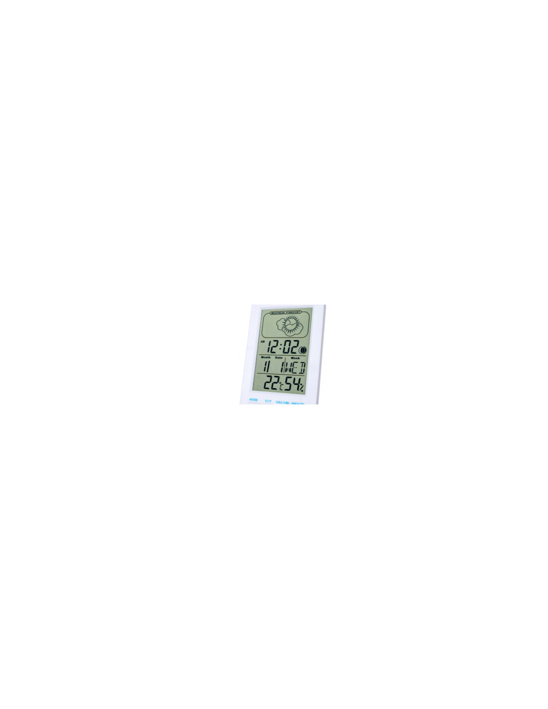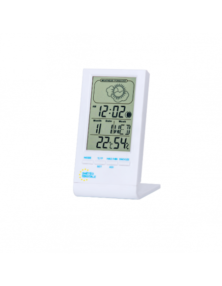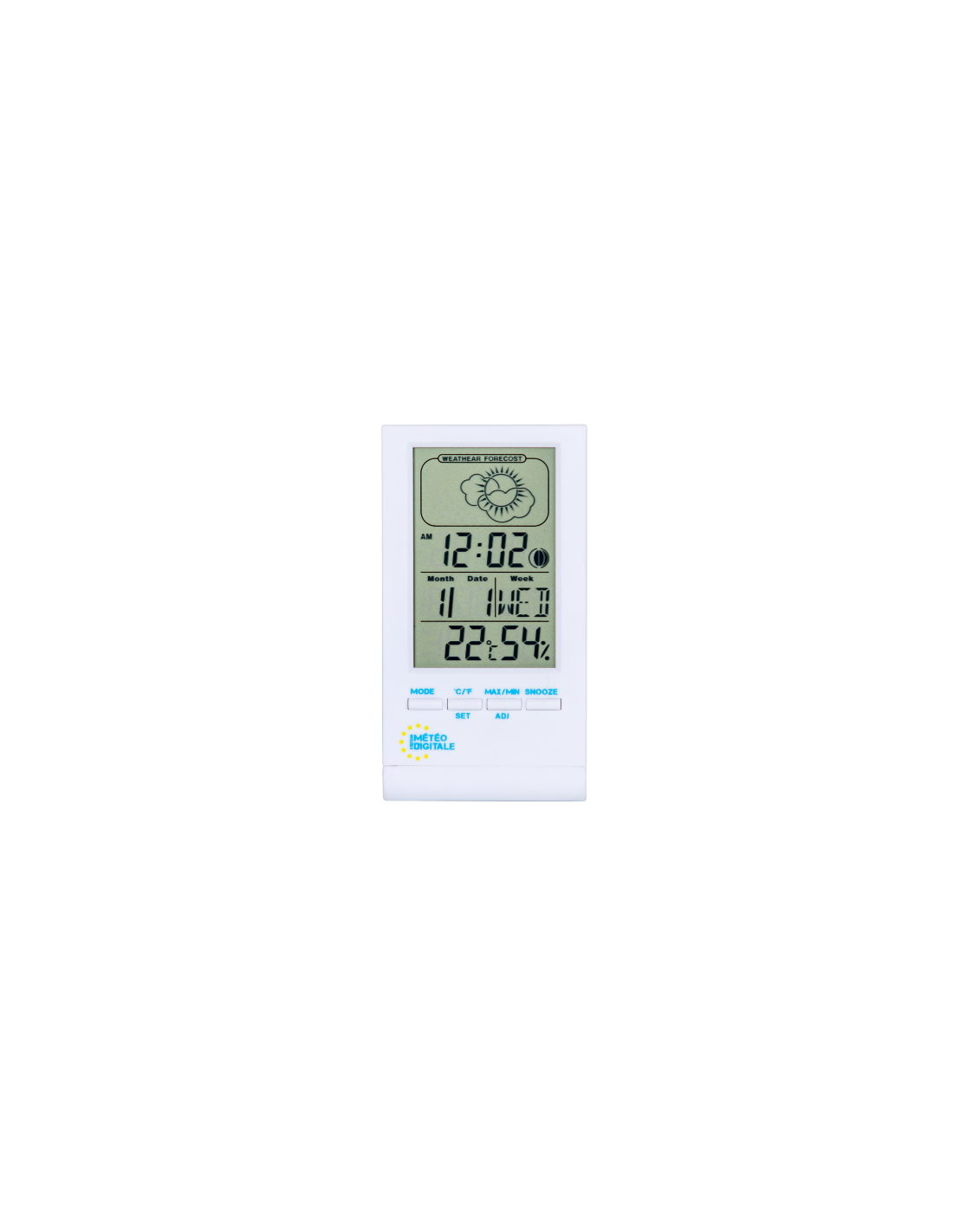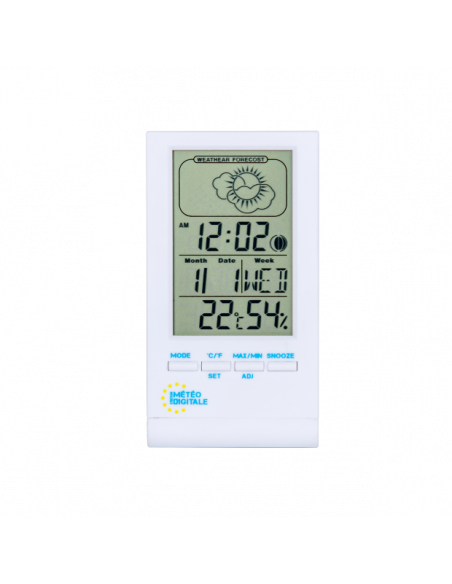 Station météo électronique avec tendances météo par pictogramme, température et hygrométrie ambiante, mini et maxi, horloge, phases de la lune.