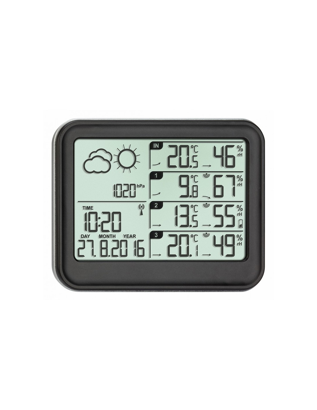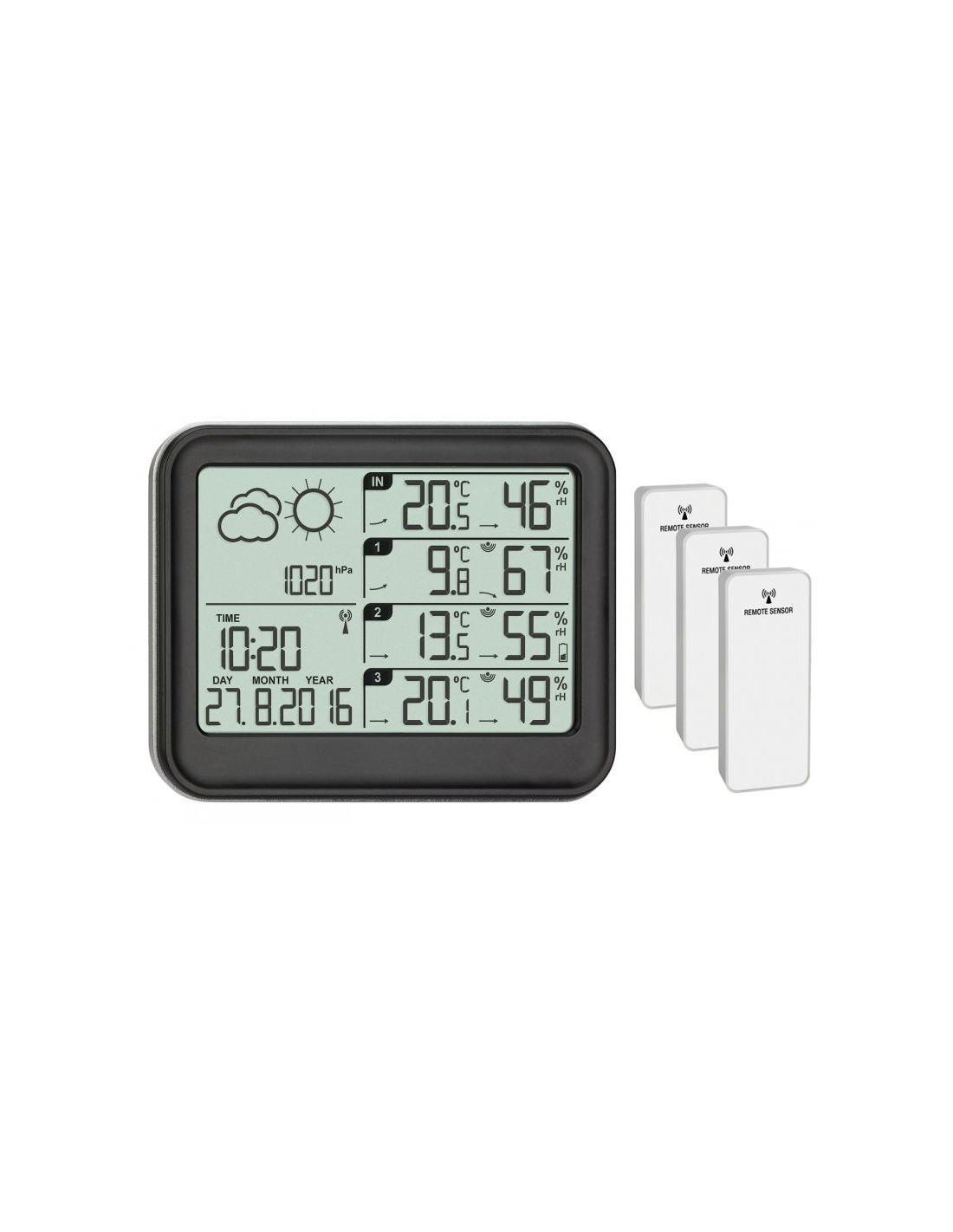 Station météo digitale livrée avec 3 émetteurs pour la mesure de la température et hygrométrie à 3 autres points que la station principale (extérieure, chambre, cave, garage...). Elle mesure également la pression atmosphérique et affiche la tendance à venir.