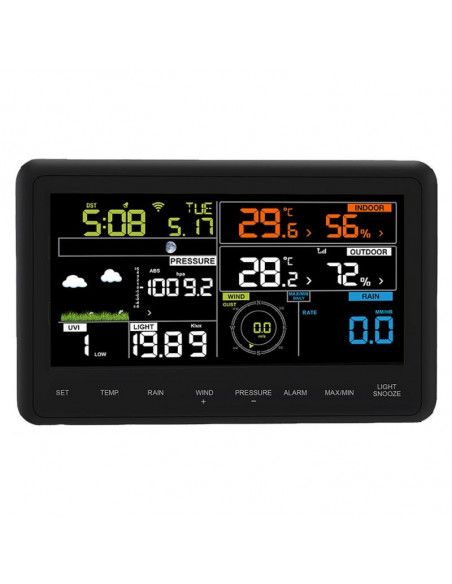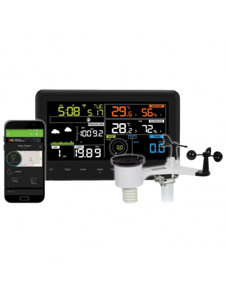 Station météo digitale avec écran couleur, livrée avec tous les émetteurs pour les mesures des conditions météo extérieures : température, hygrométrie, pluviométrie, vitesse et direction du vent, rayonnement solaire et UV.