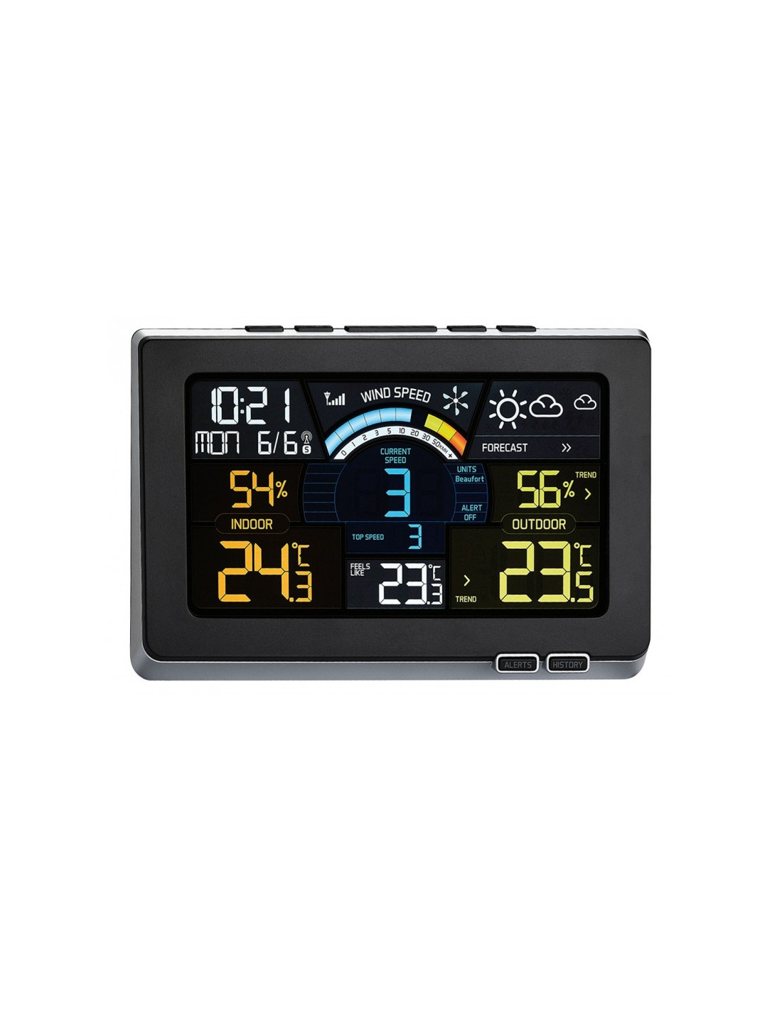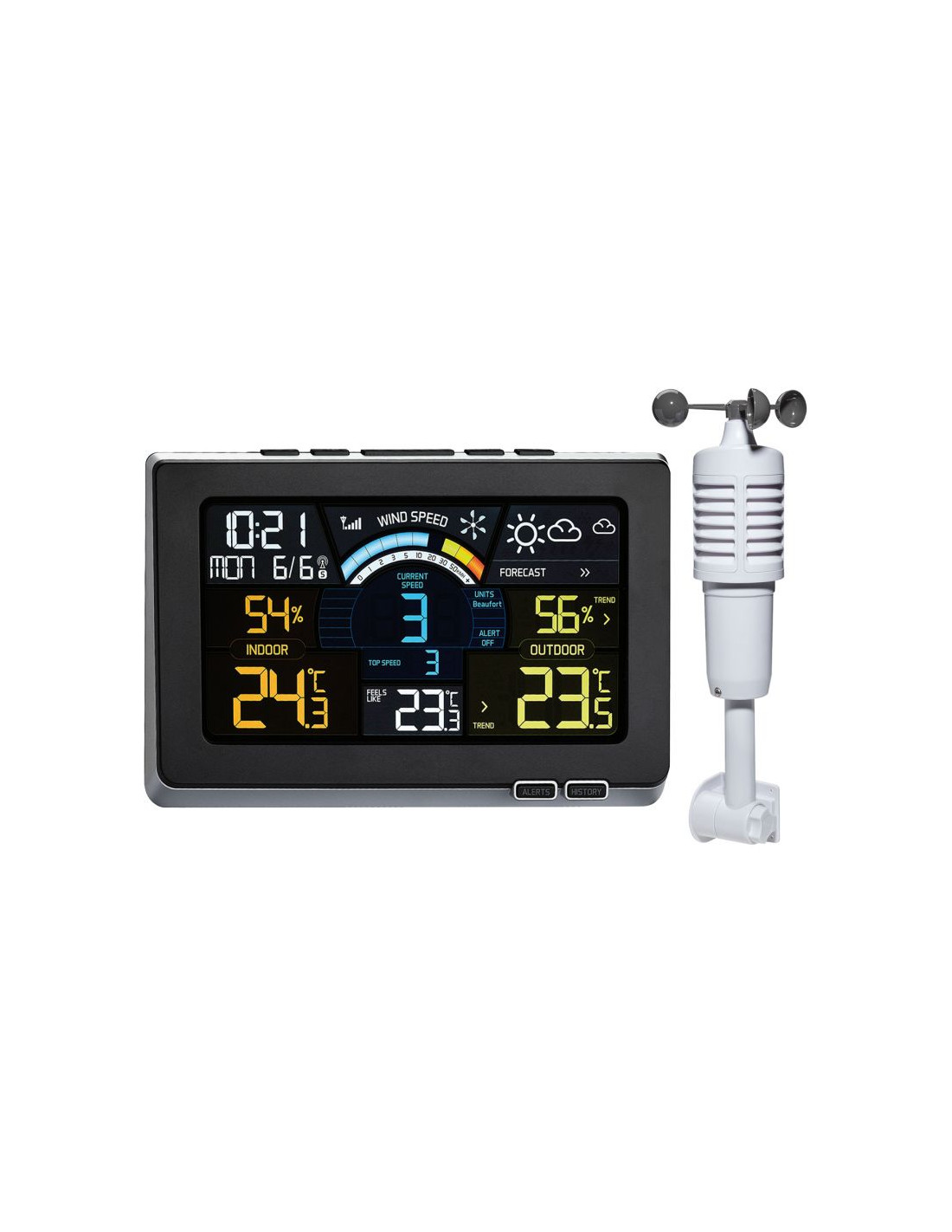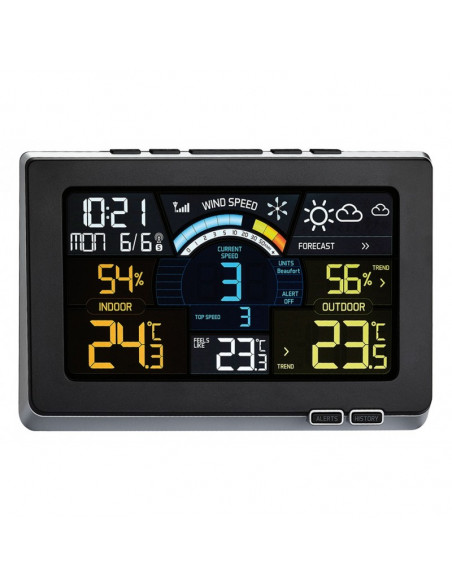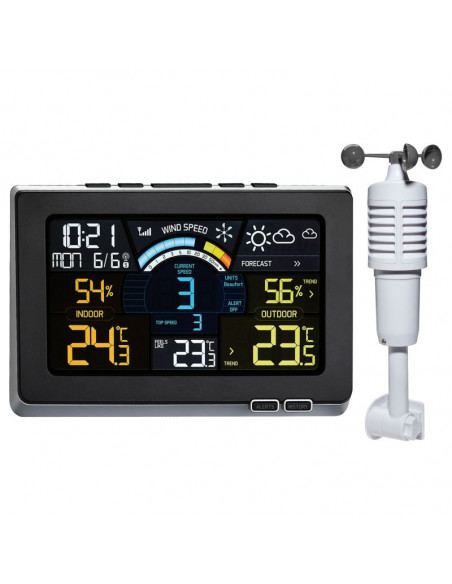 Cette station météo avec son écran couleur permet de mesurer la température, l'humidité et la vitesse du vent. Elle est livrée avec un émetteur 3 en 1 qui permet de récupérer ces données.