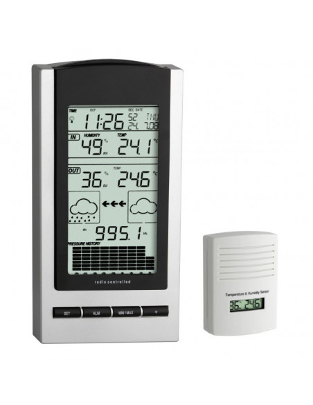 Station météo digitale classique avec températures et hygrométries intérieures et extérieures, icônes de tendance météo, relevé de la pression atmosphérique et alerte météo. Une station complète affichant toutes les informations météorologiques nécessaires
