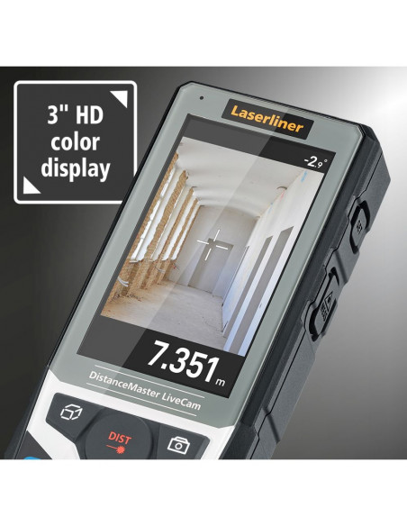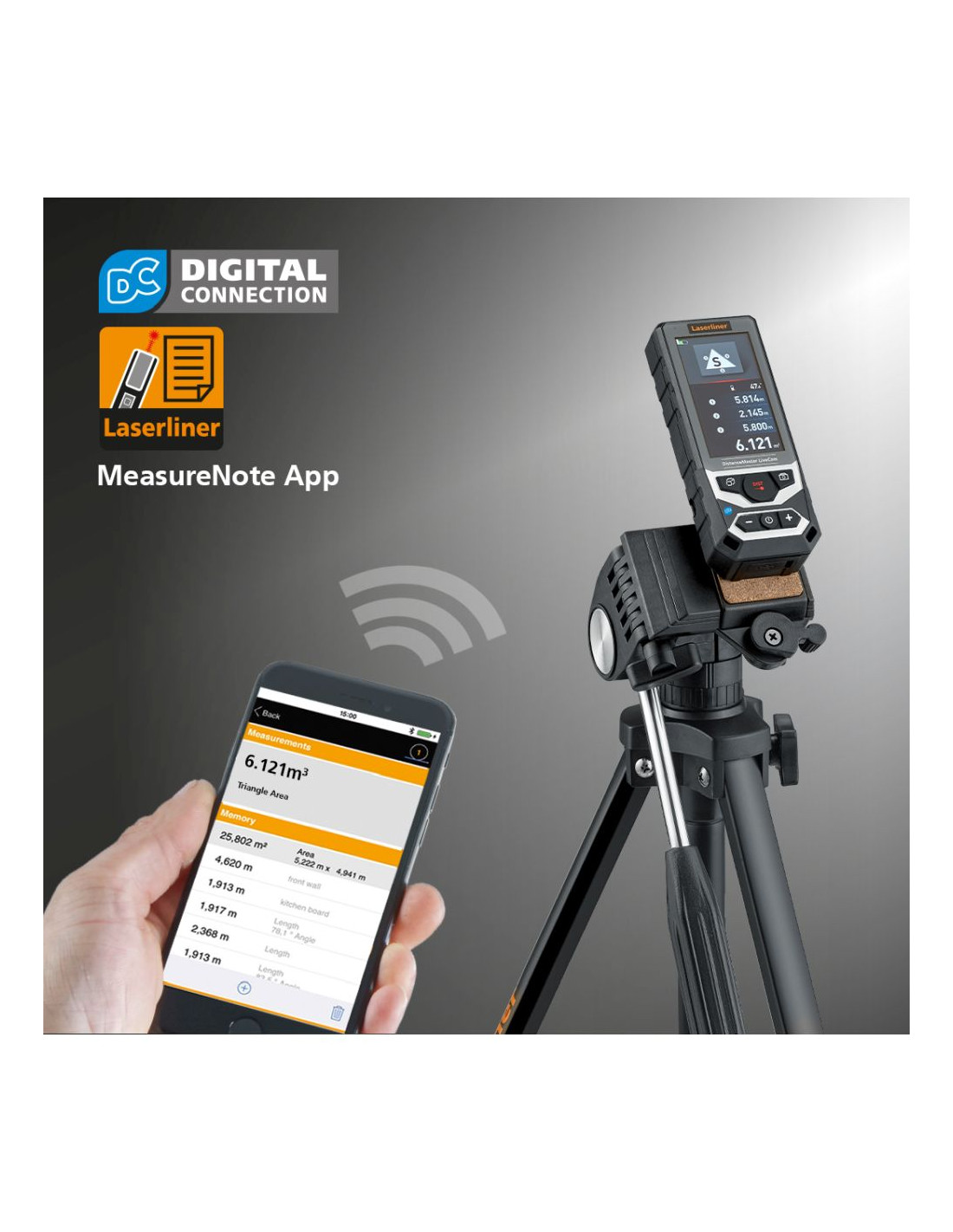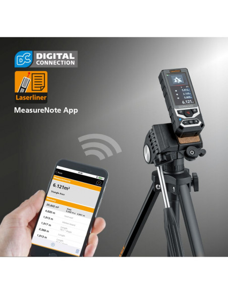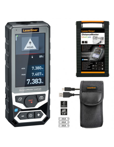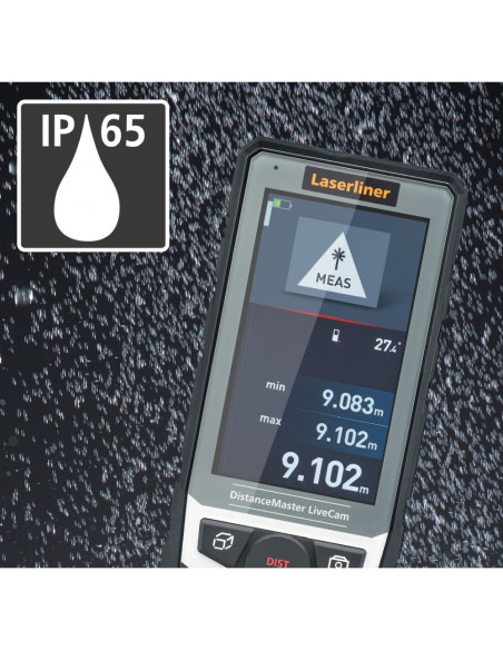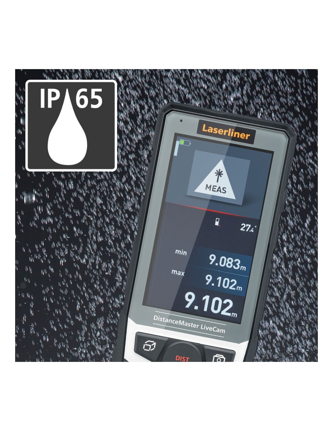 Ce télémètre laser multifonctionnel permet le calcul de surfaces rectangulaires, circulaires, du volume circulaire, de surfaces triangulaires et de surfaces trapézoïdales. Il est également possible d’effectuer des mesures point vers point et de déterminer indirectement la hauteur. Une caméra HD à zoom 4 fois grossissant automatique sert d’aide de visée efficace pendant la mesure lorsque le point laser est peu visible à grande distance ou en cas de mauvaise visibilité. En raison de la grande plage de mesure pouvant atteindre 150 m, l’appareil est idéal pour de grandes distances et peut être également utilisé à l'extérieur. Possédant le type de protection IP 65, il est bien protégé des projections d’eau et de la poussière. Il est possible de sélectionner le point de référence du boîtier (à l’avant/à l’arrière/le trépied). Une mesure rapide, la fonction minuterie pour un déclenchement automatique et l’écran bien visible rendent l’utilisation de l’appareil agréable. 50 emplacements de mémoire sont disponibles à des fins de documentation. La connexion numérique permet de transférer rapidement les données mesurées sur des terminaux mobiles grâce à l’application gratuite MeasureNote. L’appareil s’éteint automatiquement pour économiser de l’énergie en cas de non-utilisation.