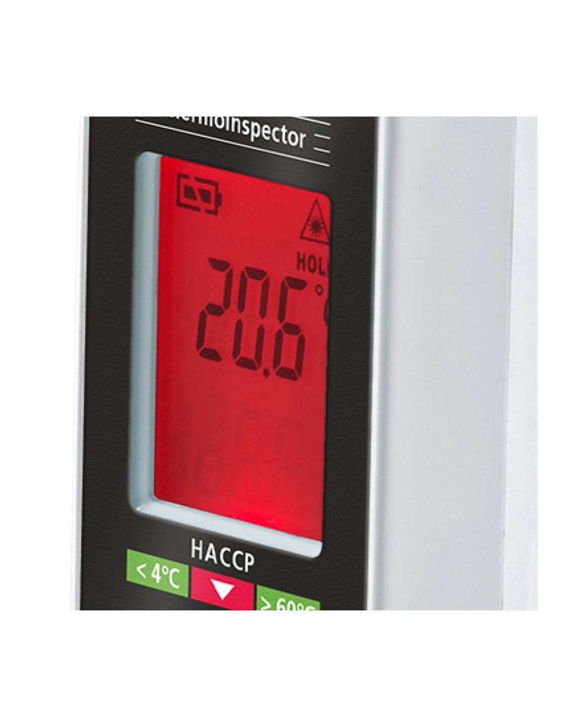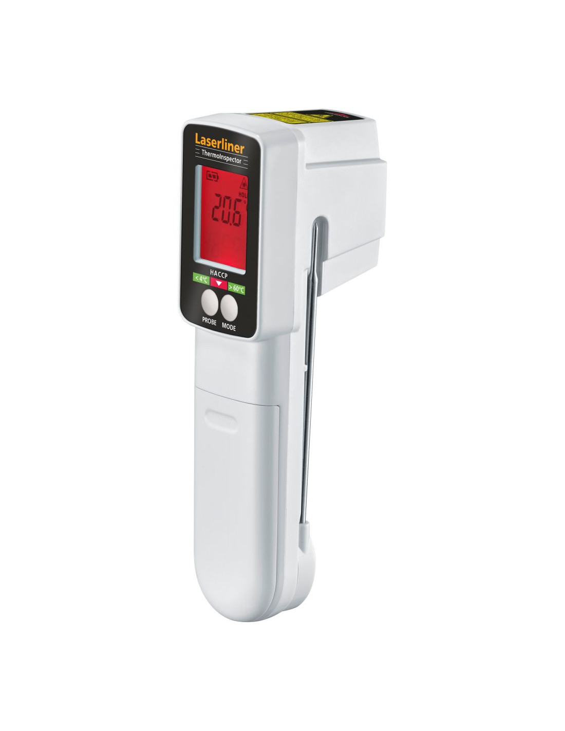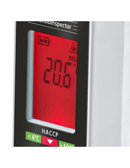 distribution de mets et de boissons, les prises de mesure aléatoires et l’arrivée de marchandises sont ses champs d’application. Les températures de surface peuvent ainsi être mesurées sans contact via une sonde infrarouge, la zone de contrôle étant ici visée par le laser. La mesure en profondeur est assurée par un thermomètre rabattable doté d’une sonde à petit diamètre permettant une mesure à 80 mm de profondeur. Un double écran LCD avec alarme de couleur permet de contrôler, comparer et localiser rapidement les points critiques. La grande plage de température de -60 °C à 350 °C comprend les points de température essentiels à la réfrigération et à la transformation des denrées alimentaires.