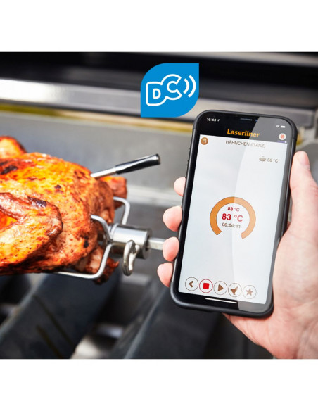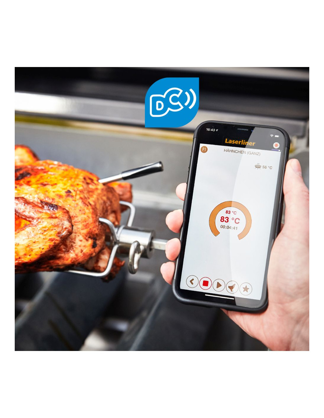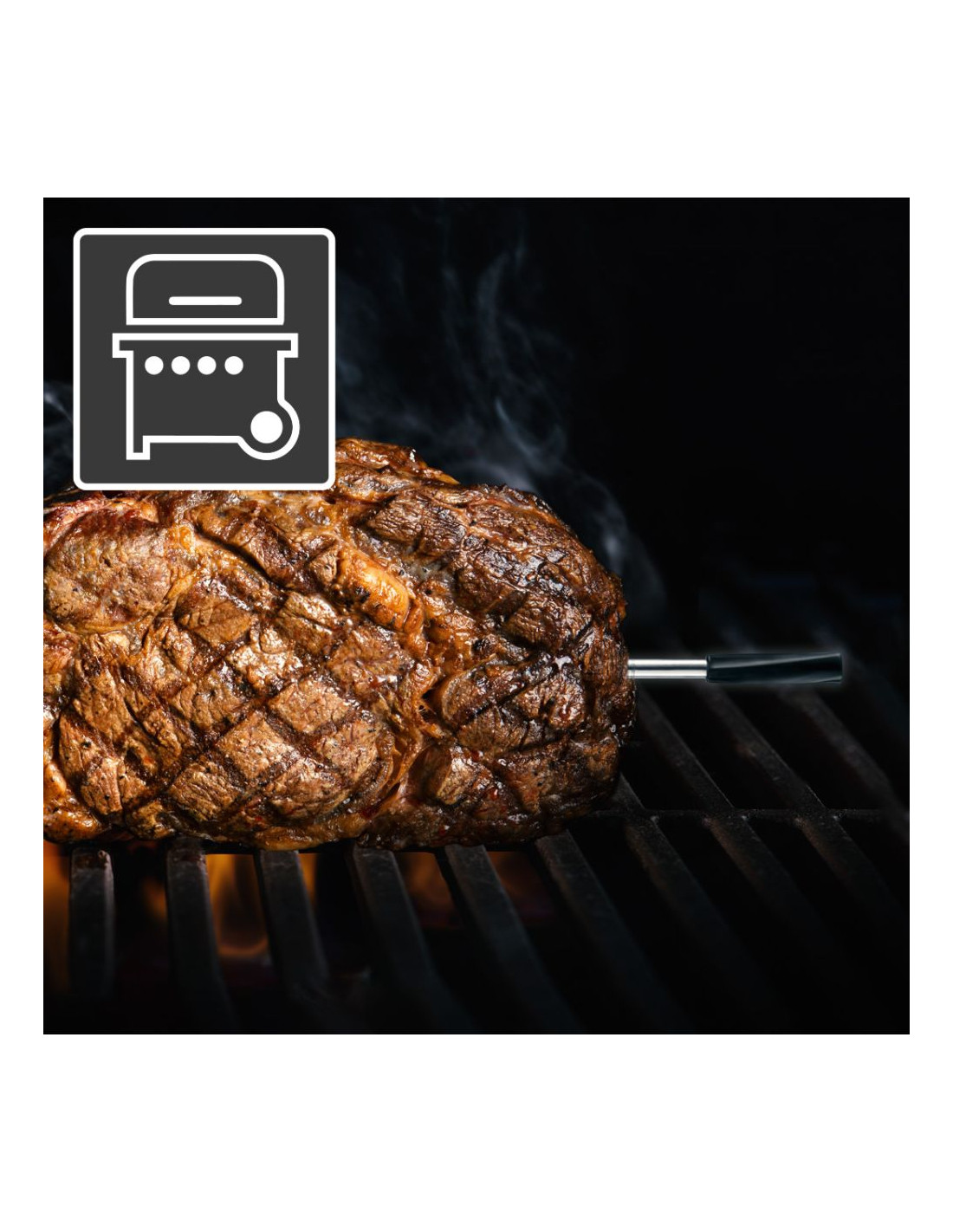 Le thermomètre sans fil permet d’obtenir des résultats de cuisson parfaits des divers types de viandes, de volailles et de poissons. Le degré de cuisson, la température à l’intérieur des aliments et la température de l’espace de cuisson sont mesurés avec précision. La transmission des données a lieu agréablement par l’appli pouvant fonctionner non seulement avec le système d’exploitation IOS, mais également avec le système d’exploitation Android.