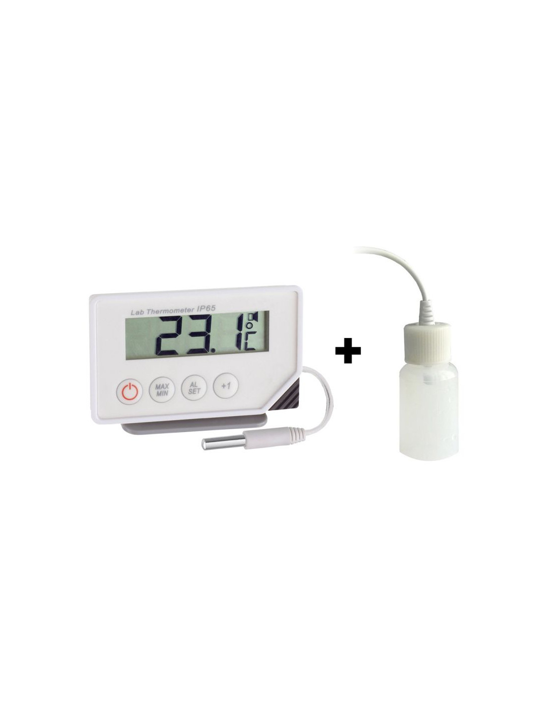 Module de température étanche IP65, conforme HACCP et conforme à la norme EN13485 (froid agro-alimentaire) livré avec une sonde de température étanche ambiante dans un flacon ralentisseur thermique pour limiter les variations rapides de températures mesurées par le thermomètre. Le thermomètre possède la fonction maximum et minimum et alarme de température en cas de dépassement de ces seuils.