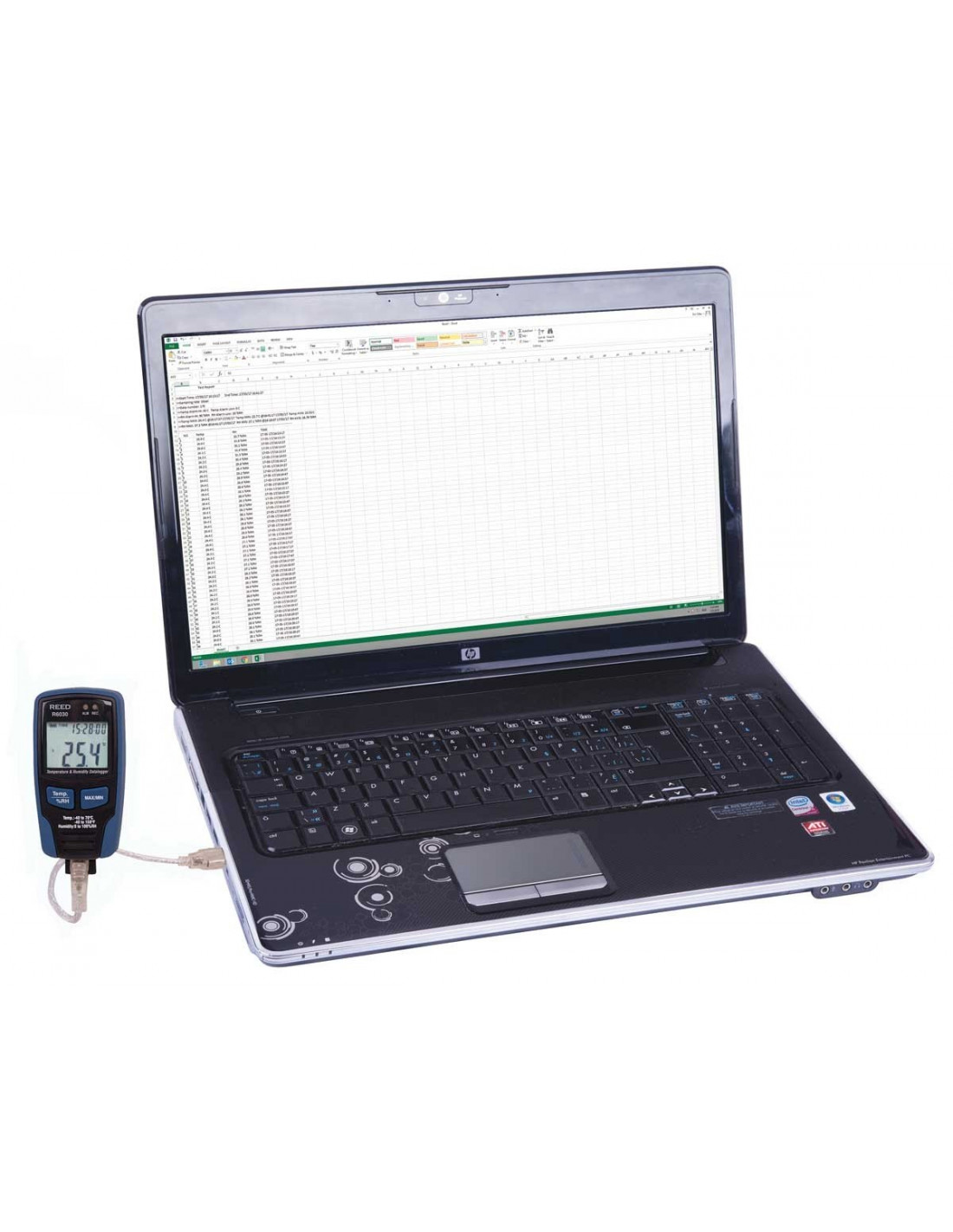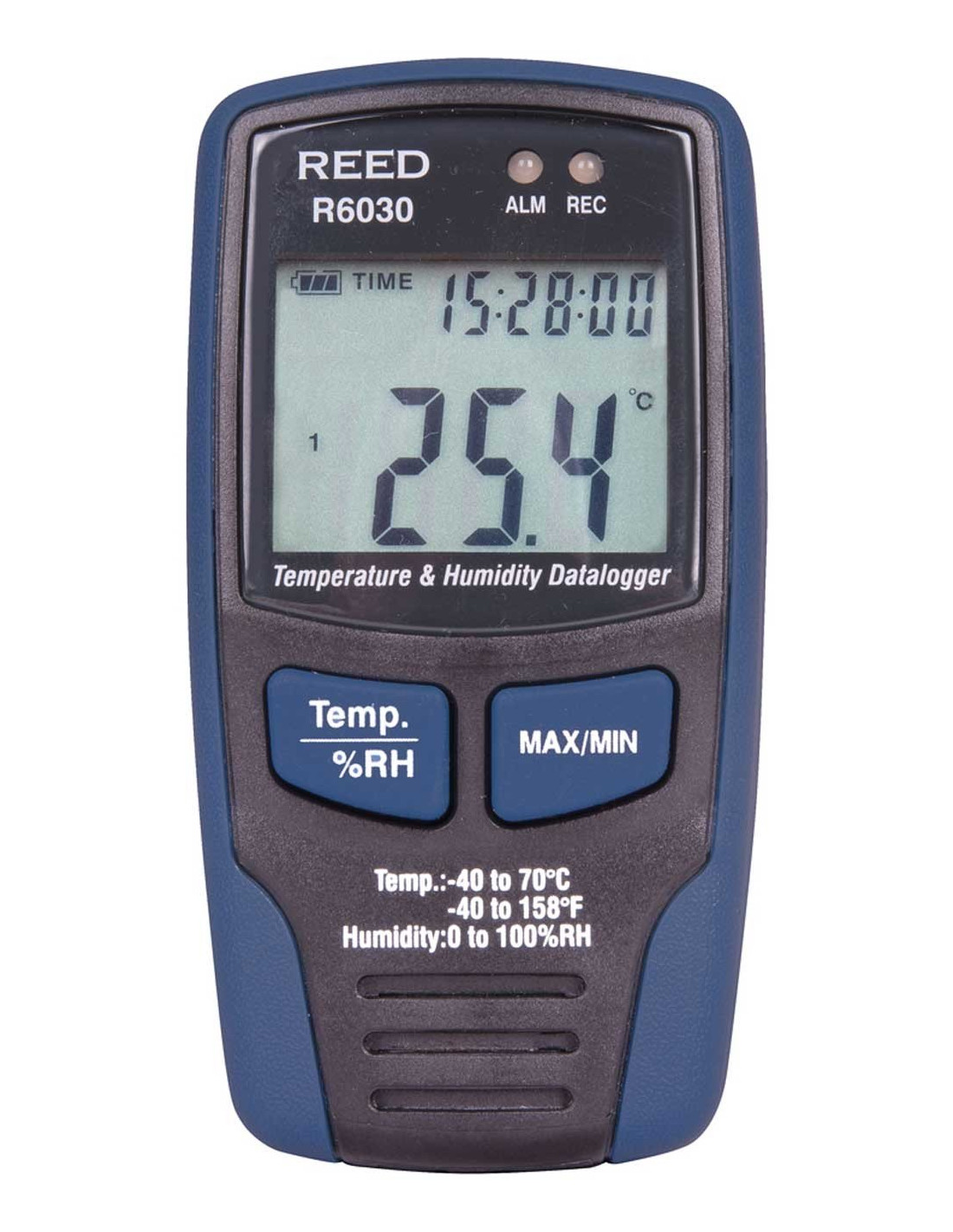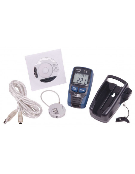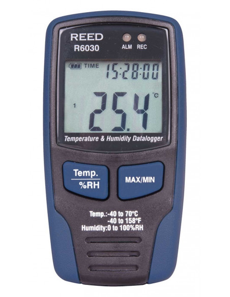 Cet enregistreur de données peut enregistrer jusqu'à 32 000 lectures de température ambiante et d'humidité relative. Branchez simplement le R6030 directement sur l'ordinateur par le câble USB fourni pour configurer les paramètres (taux d'échantillonnage, alarmes min/max) et débrancher pour commencer l'enregistrement. Le R6030 inclut une horloge en temps réel avec la date/heure indiquée et un affichage ACL pour voir les mesures en direct