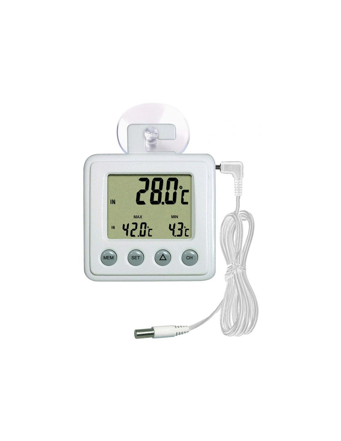 Ce thermomètre permet avec son triple affichage le contrôle simultané de la température actuelle, la température maximum et la température minimum pour chaque canal intérieur ou extérieur. Sur le même écran, les mémoires maxi/mini permettent de repérer les valeurs crêtes atteintes. Il se fixe par crochet de suspension, ventouse, aimant ou béquille. La sonde filaire se connecte avec un mini-jack. Amovible, il est facile de la remplacer si celle-ci se détériore.