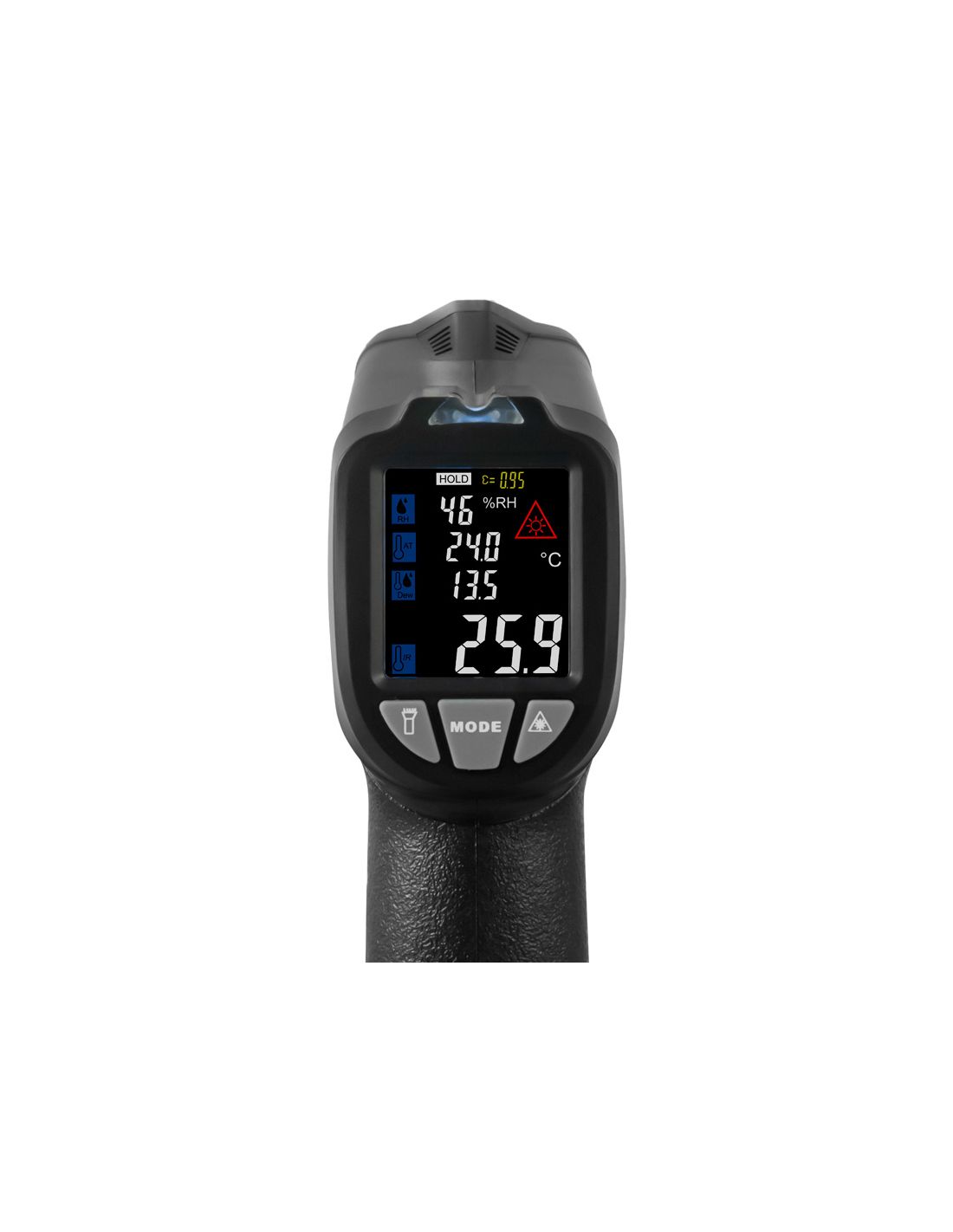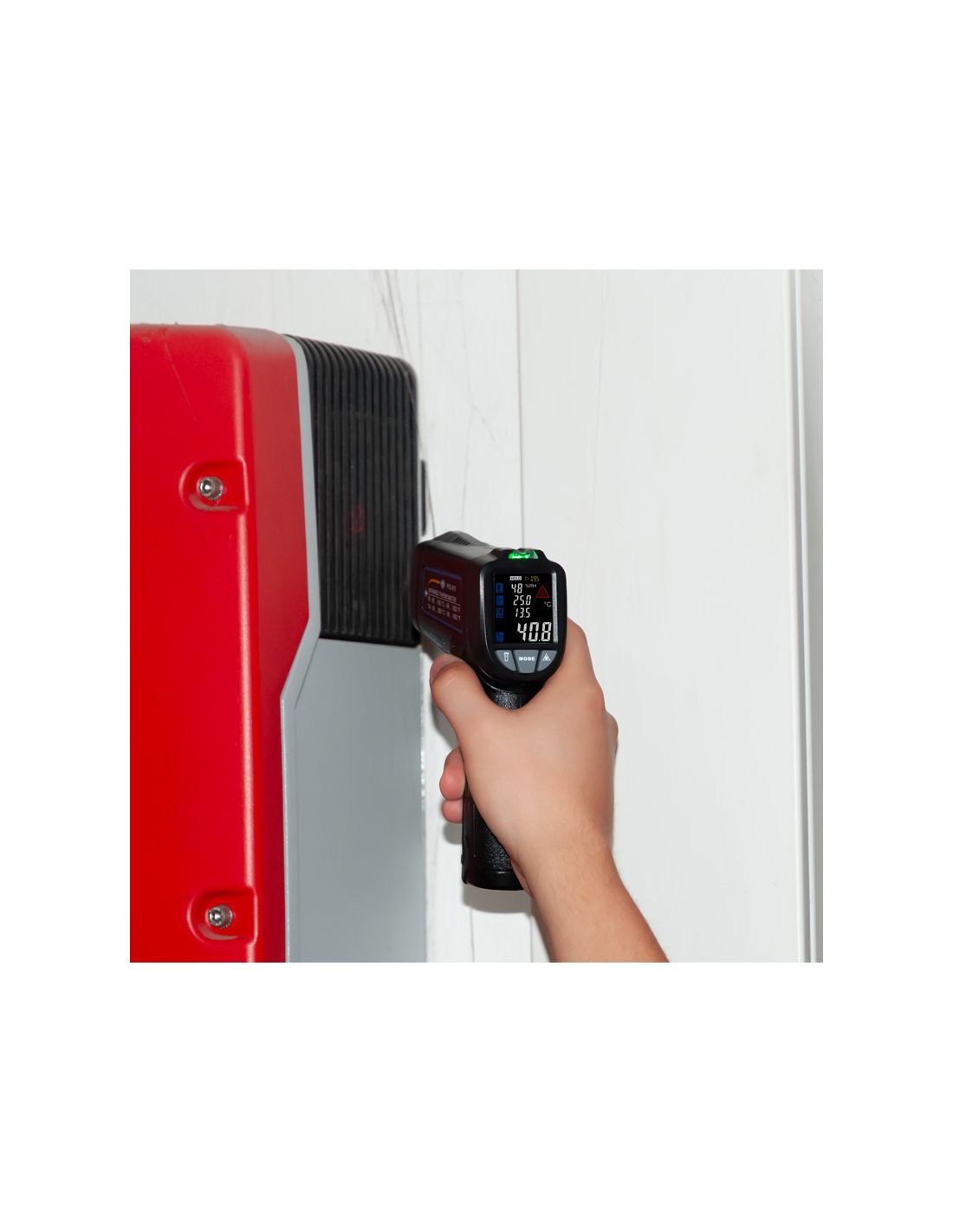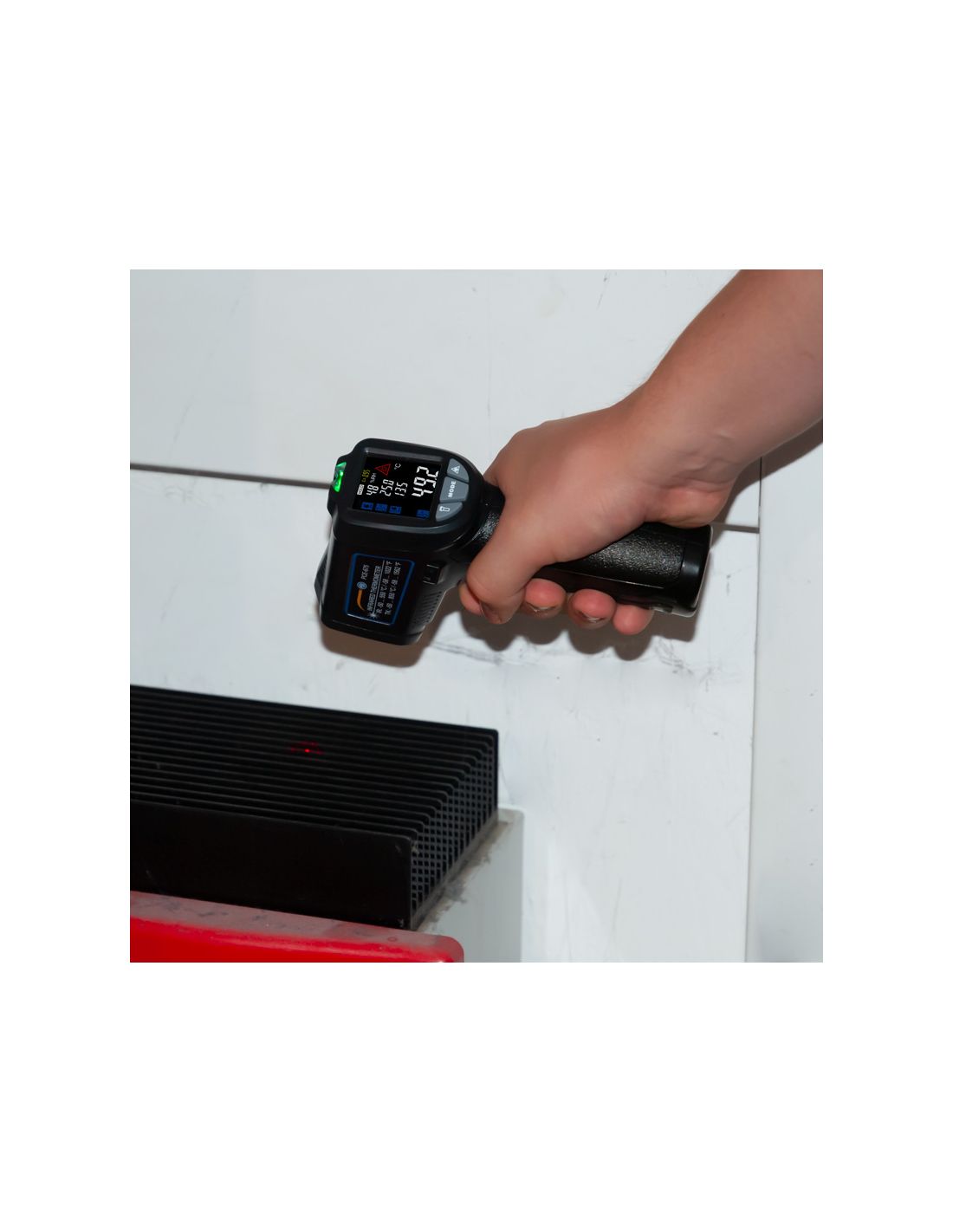 Thermomètre infrarouge avec pointeur laser facile à utiliser / Entrée pour sondes de type K / Mesure de la température superficielle, de la température et de l'humidité ambiante, et du point de rosée Le thermomètre infrarouge possède une optique 13:1 lui permettant de mesurer la température superficielle à distance, ainsi que la température et l'humidité ambiante. Son utilisation simple et son pointeur laser rouge le rendent très avantageux. Ces caractéristiques aident à orienter le thermometre infrarouge pour obtenir des mesures précises. Le thermomètre infrarouge est multifonction. La lampe intégrée permet d'éclairer le point que vous souhaitez mesurer lorsqu'il se trouve dans un endroit sombre. Grâce aux réglages individuels du thermomètre infrarouge, vous pouvez mesurer différents types de températures ainsi que l'humidité. Vous pouvez régler la valeur d'émissivité du thermomètre infrarouge entre 0,1 et 1,0, ce qui couvre plus de 90 % des applications de mesure de température.