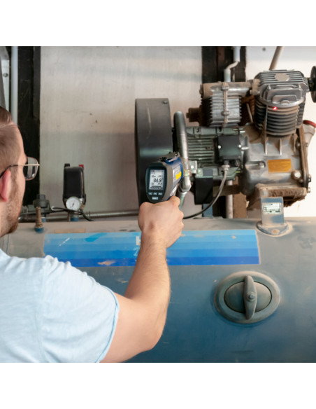 Il est aussi possible de mesurer, sans laisser de trace, la température de tôles et autres pièces qui viennent d'être laquées. Le thermomètre à double rayon laser s'utilise aussi dans d'autres secteurs de l'industrie et dans des ateliers pour travaux de maintenance. Le thermomètre est idéal pour mesurer des éléments en mouvement ou qui sont sous tension. La particularité de ce thermomètre à double rayon laser est son court temps de réponse de 150 ms, sans avoir besoin de toucher l'objet. Vous pouvez aussi utiliser le thermomètre dans l'industrie alimentaire, puisqu'il évite de contaminer les produits. Le thermomètre possède une interface Bluetooth pour transférer les données. L'appareil possède aussi une entrée pour connecter un capteur de température de type K. Cela vous permet de mesurer non seulement par infrarouge, mais aussi par contact, ce qui fait de ce thermomètre un appareil versatile. Le thermomètre vous offre la possibilité de définir des seuils d'alarme et de régler le degré d'émissivité.
