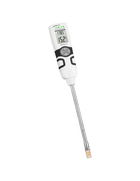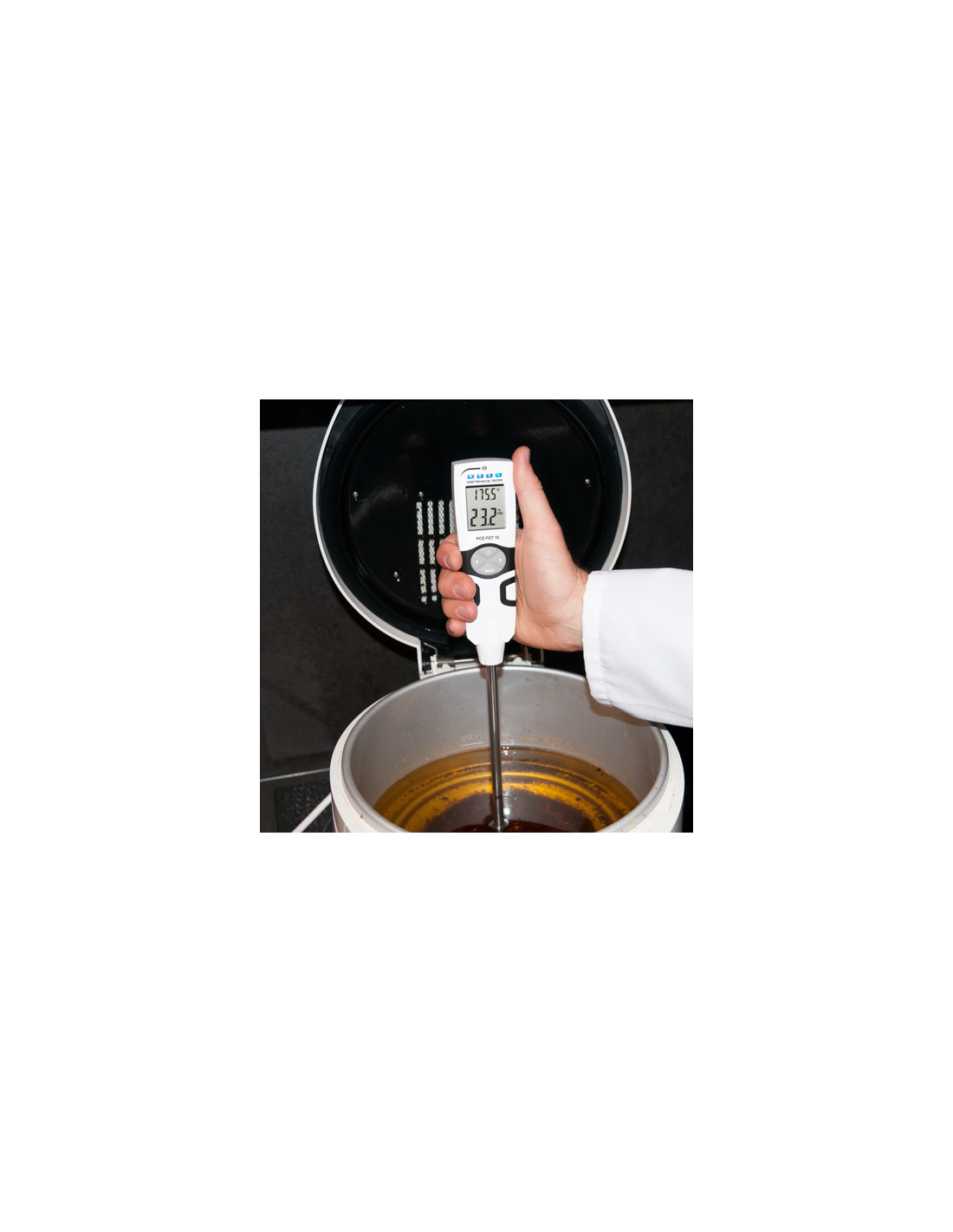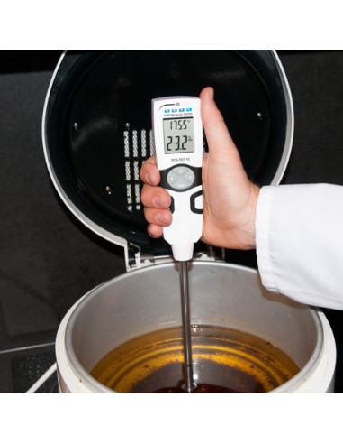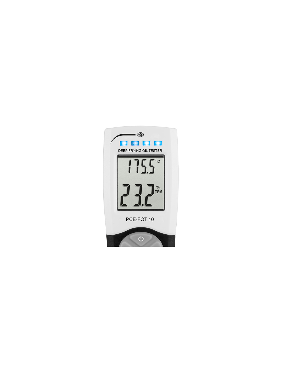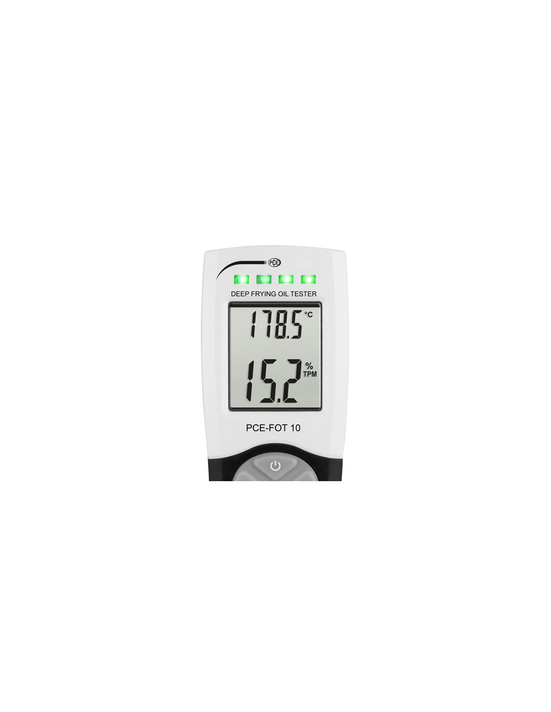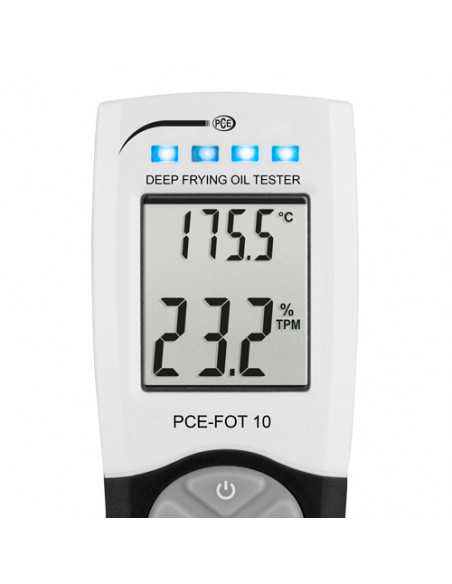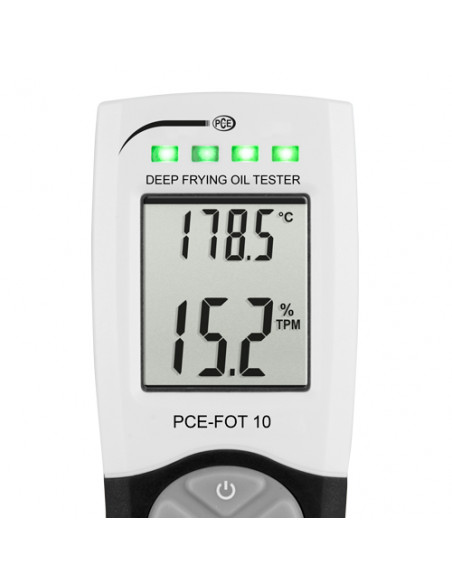 La mesure est effectuée directement dans l'huile en introduisant la pointe de mesure dans la friteuse. Cela garantit un résultat immédiat. En effet, en quelques secondes, vous obtenez la température de l'huile en ºC et la qualité de l'huile en PC (Polar Compounds, en français: composés polaires). La valeur PC est une mesure qui indique le degré de vieillissement thermique et oxydatif de l'huile de friture. Une LED indique la qualité de l'huile au moyen de couleurs. Ce thermomètre pour friture n'est pas seulement utilisé par les inspecteurs de l'action sanitaire, mais aussi dans la gastronomie, puisque ce secteur nécessite un niveau élevé de qualité.