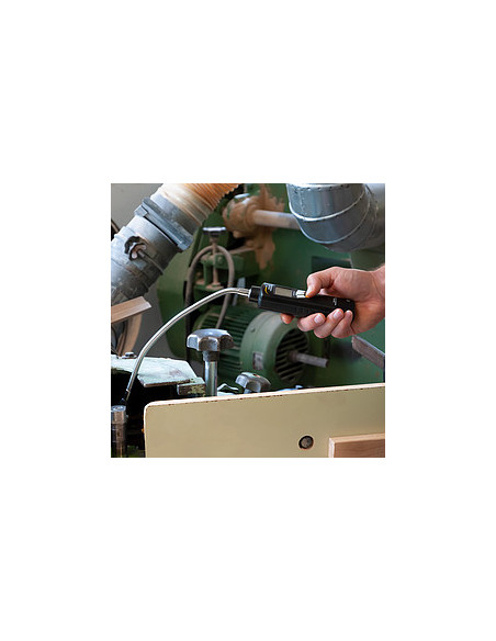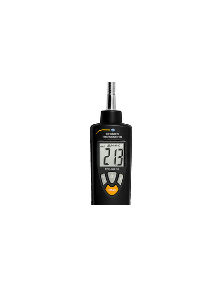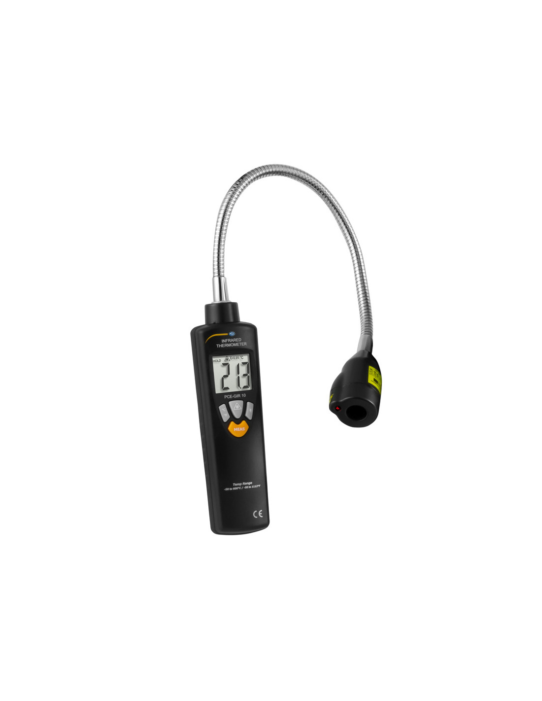 Le thermomètre PCE-GIR 10 est un appareil facile à utiliser, il est en format poche et il a un excellent rapport qualité-prix. Ce thermometre est idéal dans l'industrie, les ateliers et pour les travaux de maintenance des systèmes de chauffage, de ventilation et de climatisation, pour l'automation, le contrôle d'installations électriques et des armoires de distribution. Le thermomètre possède un écran rétroéclairé qui permet de lire les valeurs sur l'écran, même dans des zones sombres. Il dispose d'un pointeur laser pour viser avec précision le point de mesure, ce qui permet de mesurer la température rapidement et précisément à une distance sûre des objets chauds ou en mouvement. Le fait que le capteur soit intégré dans une sonde semi-rigide vous permet d'utiliser le thermomètre PCE-GIR 10 pour mesurer dans des endroits difficiles d'accès. Le degré d'émissivité de ce thermomètre est fixe et a une valeur de 0.95, ce qui couvre environ 90 % des travaux de mesure.