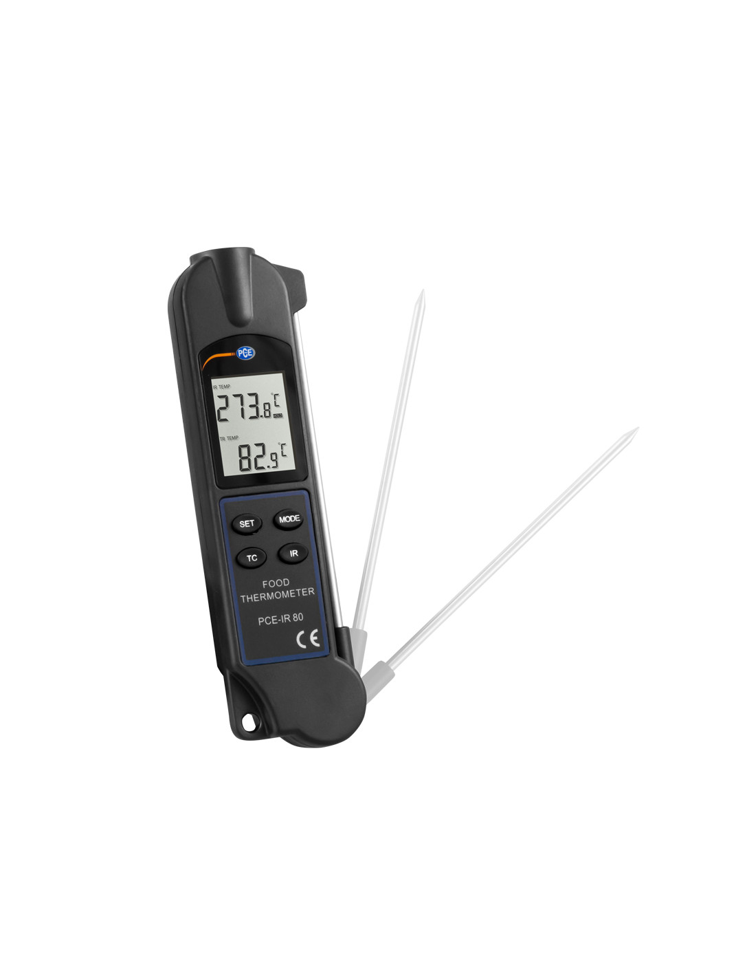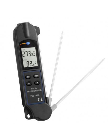 Nos équipes d'expert de la mesure ont sélectionné pour vous cet instrument de mesure à la fois précis, robuste et en provenance de la marque PCE, acteur reconnu de la mesure. Le thermomètre infrarouge pour aliments PCE-IR 80 a été conçu pour le contrôle immédiat de la température des aliments. Le thermomètre infrarouge pour aliments s'utilise dans les cuisines industrielles, les services de catering et entrepôts réfrigérés. Le thermomètre infrarouge pour aliments permet de mesurer la température de deux façons. D'un côté, il peut mesurer la température d'un objet sans contact, en utilisant le capteur infrarouge. La plage de mesure va de -35 à +330 ºC.