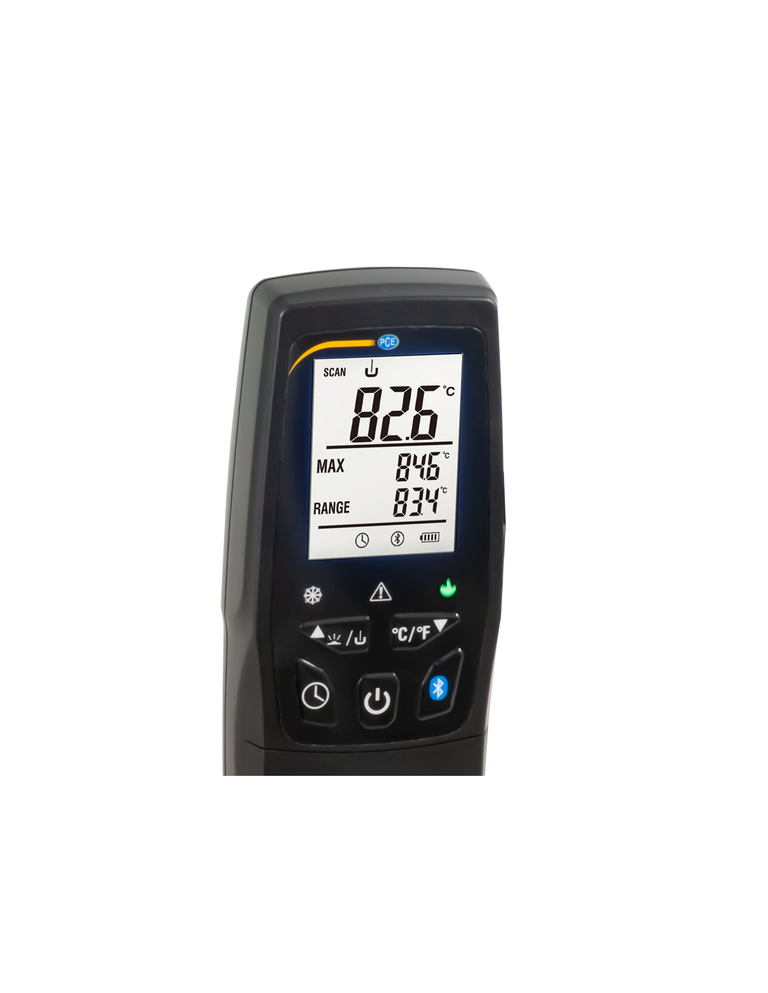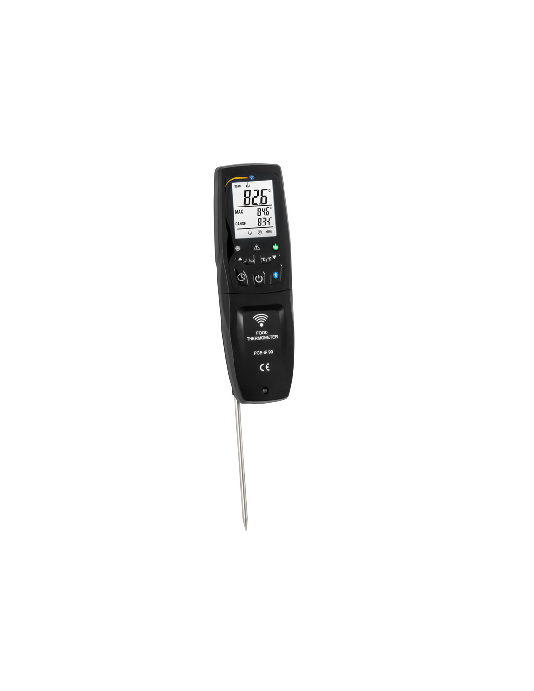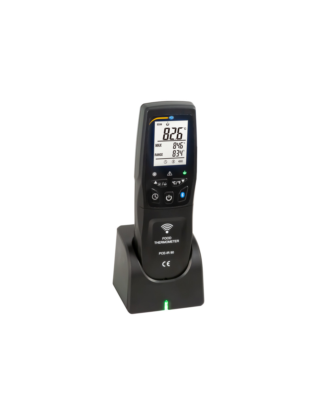 Thermomètre infrarouge avec Bluetooth / Plage: -40° +300 °C / Chargeur / Sonde de pénétration pour mesurer la température interne / Écran rétroéclairé / Indicateur d’évaluation de la température / Chronomètre / Émissivité 0,95 fixe