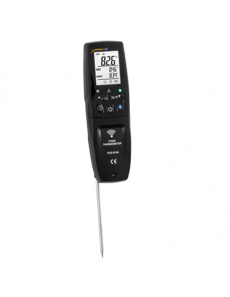 Grâce à ce thermometre infrarouge, vous pouvez mesurer la température de surface en utilisant le capteur infrarouge, et la température interne en utilisant le capteur de pénétration pliable. Les deux capteurs du thermomètre mesurent la température sur une plage allant de -40 à 300 ºC. En plus d’afficher la valeur de température, le thermomètre infrarouge possède un indicateur d’évaluation de la température. Cet indicateur du thermomètre infrarouge signale si la température de l’aliment est optimale. Une LED rouge indique si la température se trouve entre 4 et 65 ºC. Une LED verte indique si la température est inférieure à 4 ºC ou supérieure à 65 ºC. Cette fonction du thermomètre infrarouge est particulièrement importante puisqu’elle permet de contrôler la chaîne de température. C’est la raison pour laquelle ce thermomètre infrarouge s’utilise principalement dans l’industrie alimentaire.